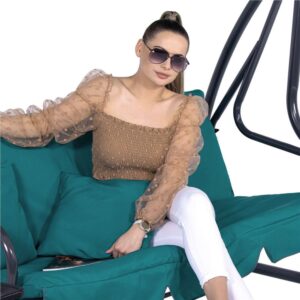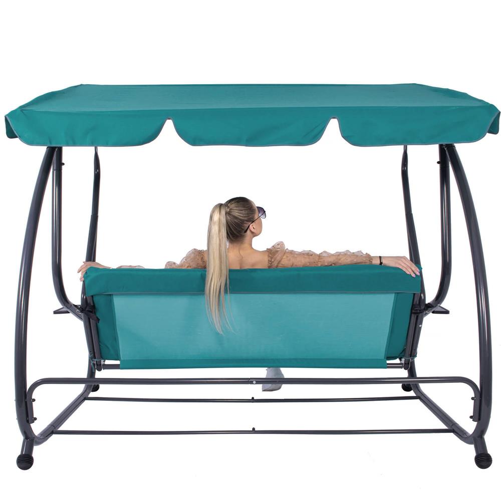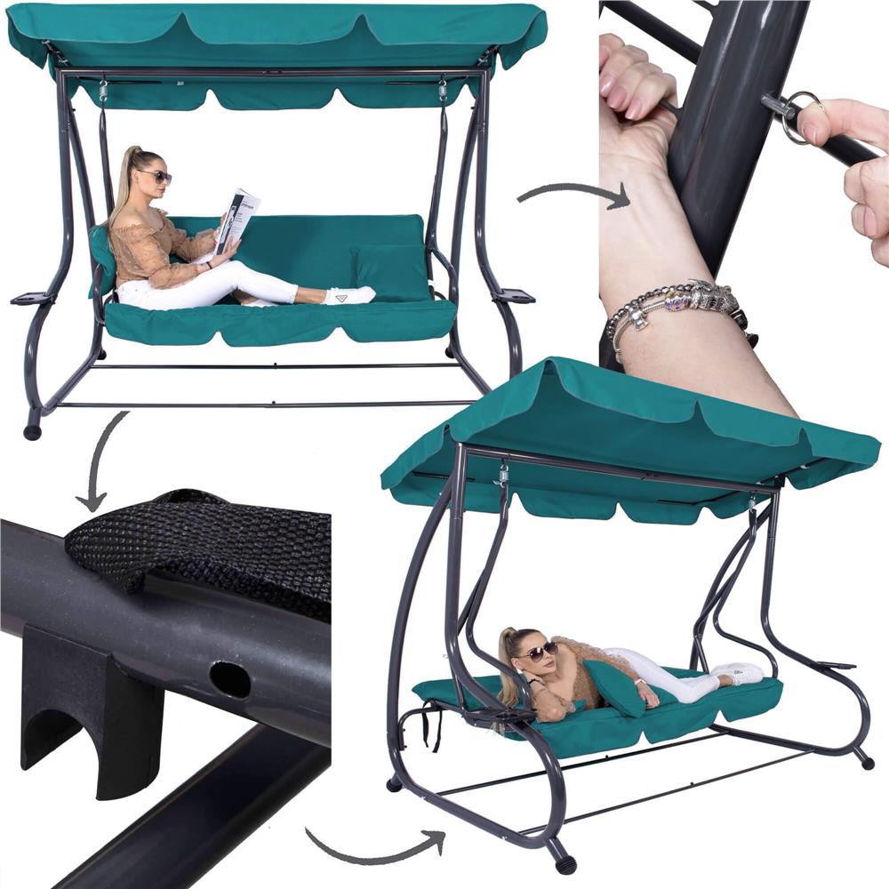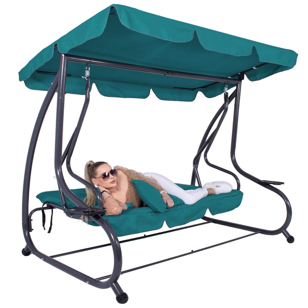 A bézs színű, három személyes kerti hinta sok innovatív ötlet felhasználásának köszönhetően sokoldalú termék. A fekvő helyzetbe összecsukható kényelmes szék lehetővé teszi, hogy egy hét munka után teljesen ellazuljon a szabadban.