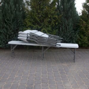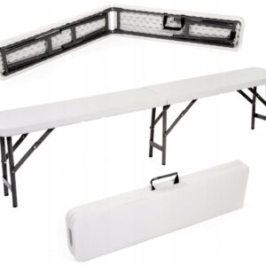Bőröndbe összecsukható nagy catering asztal, ideális otthoni és kerti használatra, bankettek és egyéb rendezvények étkeztetésére. Nagyon praktikus és könnyű. Acél konstrukció. Szék erős és vastag műanyagból. Praktikus bőröndbe hajtva, így kis helyet foglal és könnyen szállítható.