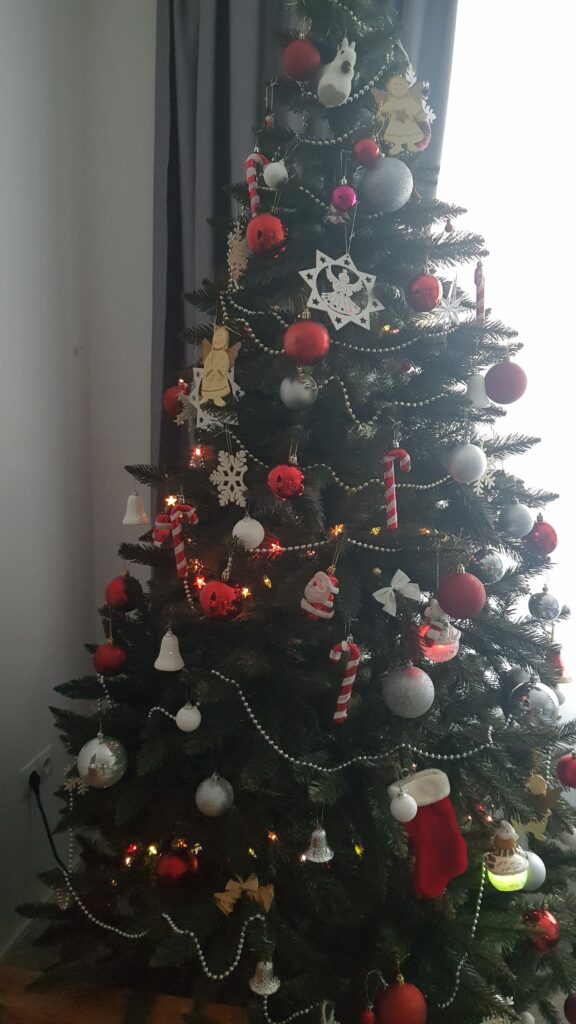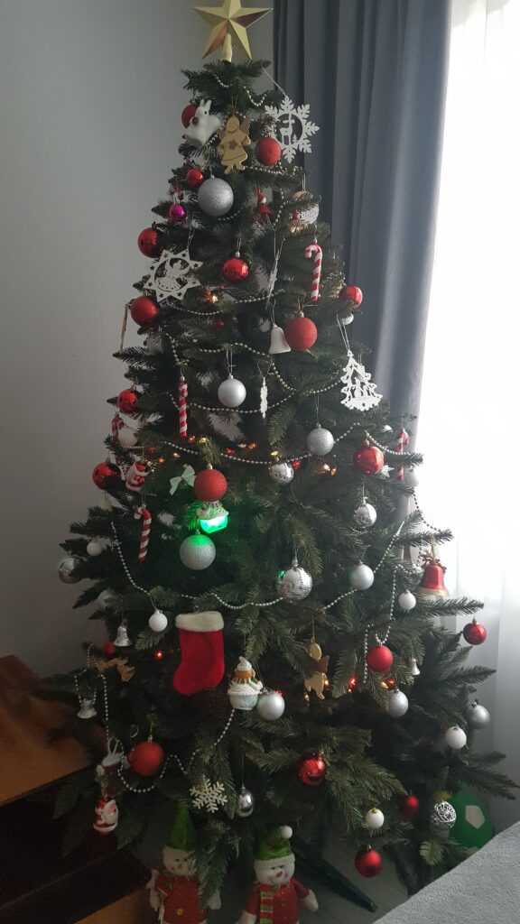 Verdele bradului putea fi putin mai deschis, mai intens; imi da impresia ca e un brad natural dupa 2 saptamani,si te astepti sa cada acele cand replasezi un glob dat jos de copii. 🙂