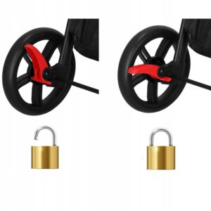 - A babakocsi két piros lábzárral van felszerelve.