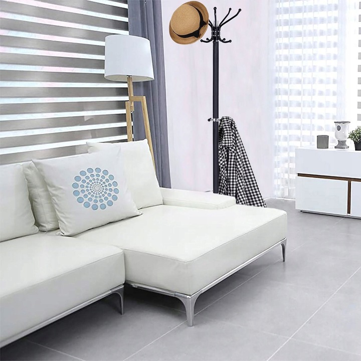 Cuier tip pom din metal cu baza de marmura, 14 agatatoare, 176cm, negru