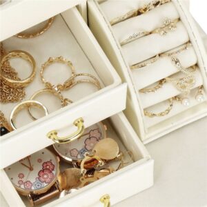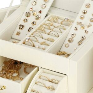 A dobozban további tárolóhely található az alsó fiókokban. Ez lehetővé teszi, hogy több ékszert tároljon benne. Ezen kívül a doboz oldalfalai nyílnak, ott találsz horgokat a medálok vagy nyakláncok felakasztására és egy gumiszalaggal ellátott zsebet.