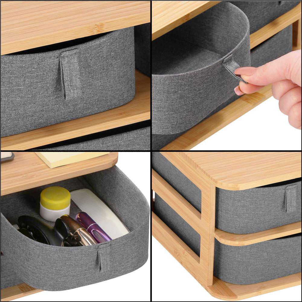 Szervezőnk három fiókot tartalmaz (két kisebb és egy nagyobb). Ez a felosztás lehetővé teszi különféle tárgyak, például ékszerek vagy irodai kellékek tárolását. Tökéletesek a gyerekszobába, ahol apró játékok, például figurák vagy művészeti kiegészítők válogathatnak. Használhatók kozmetikumok tárolására is a fürdőszobában.