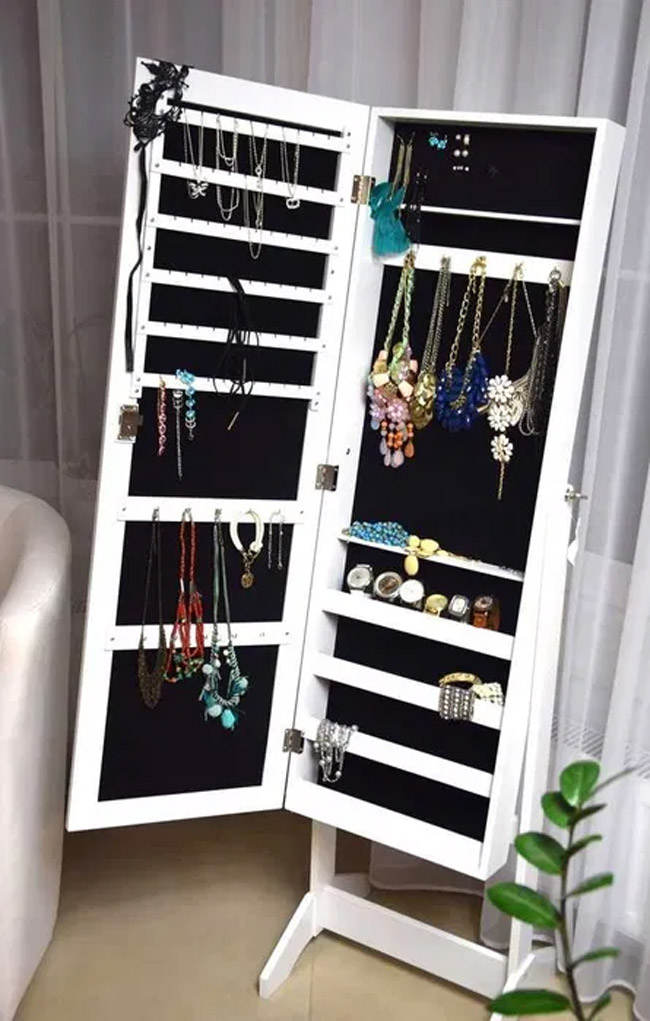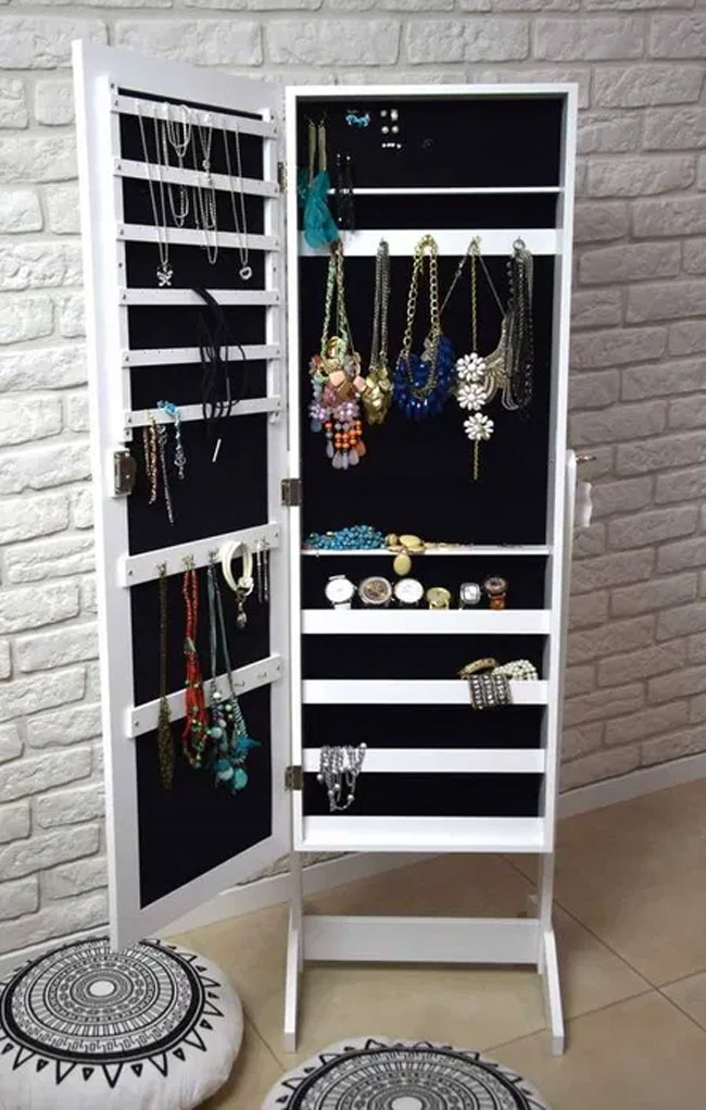 Puteti agata lanturi, bratari pe carligele din mijloc, iar rafturile pot fi folosite pentru a depozita parfumuri, produse de ingrijire a pielii si de machiaj. In acest fel, puteti avea toate accesoriile intr-un singur loc si perfect aranjate.