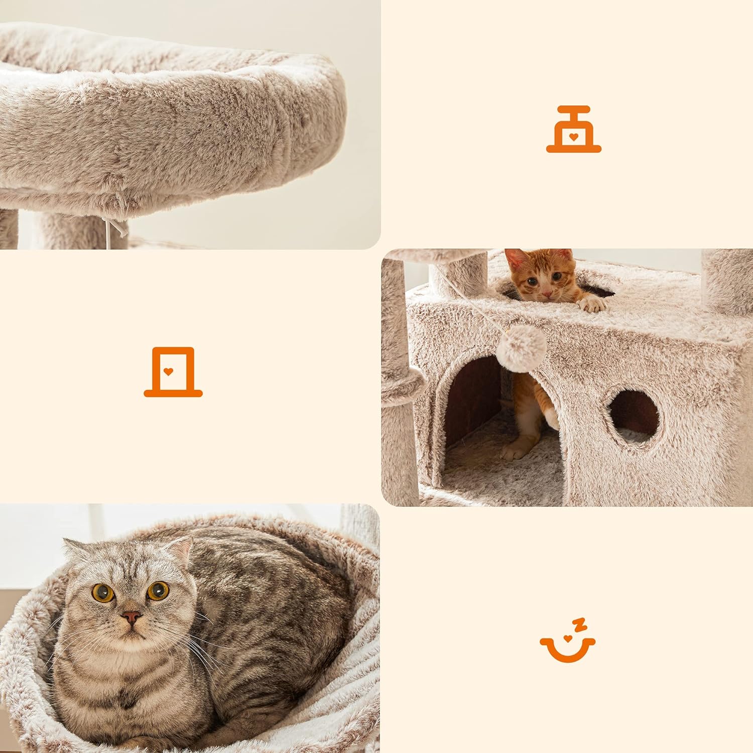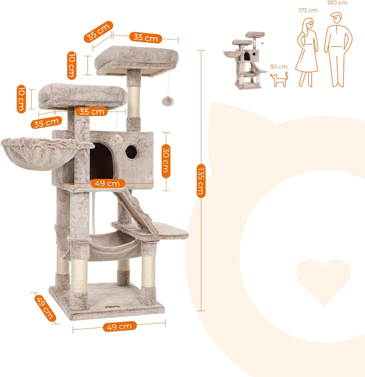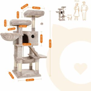 Acest ansamblu de joaca pentru pisici inalt de 135 cm este acoperit cu plus de 500 g/m² (mai moale, mai dens si mai pufos) pentru ca pisica dvs. sa se simta confortabil aici.