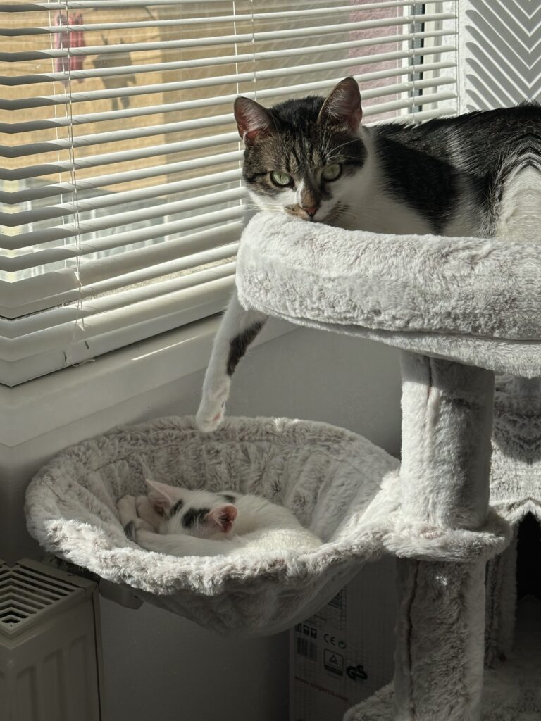 Doi pisici fericiti in cat tree