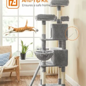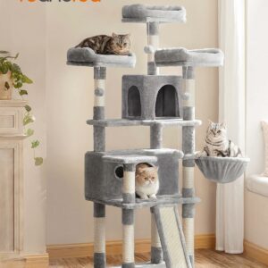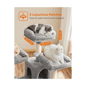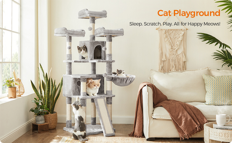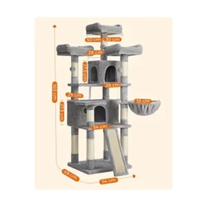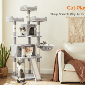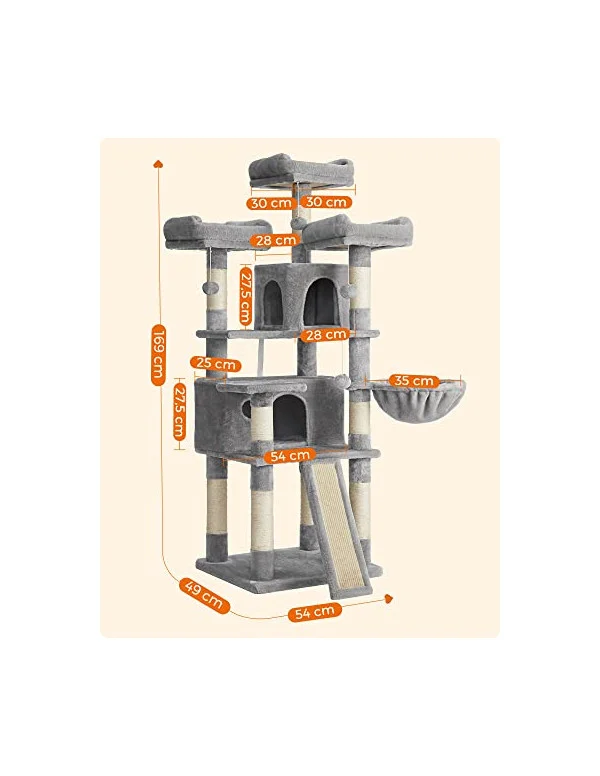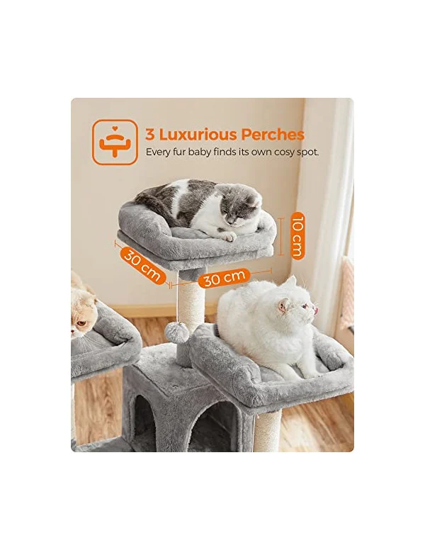 3 platforme mari, 2 pesteri, 1 cosulet si 3 mingi de blana… atat de multe activitati! Cu o placa de baza intarita si un kit anti-inclinare, acest mobilier stabil este perfect pentru joaca. Datorita placii de zgariat mari si rezistente si a stalpilor de zgariat, acest ansamblu pentru pisici va prelungi considerabil durata de viata a canapelei si a tapetului dvs.