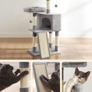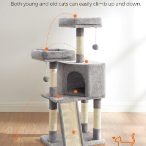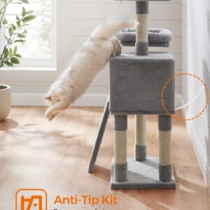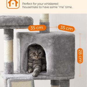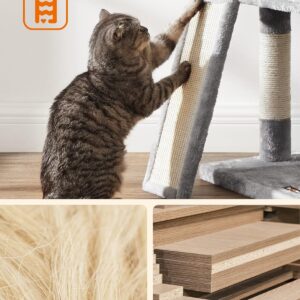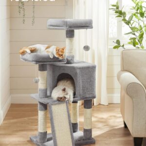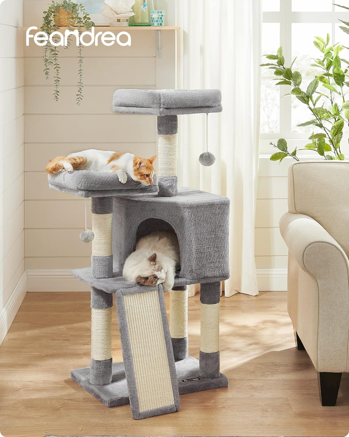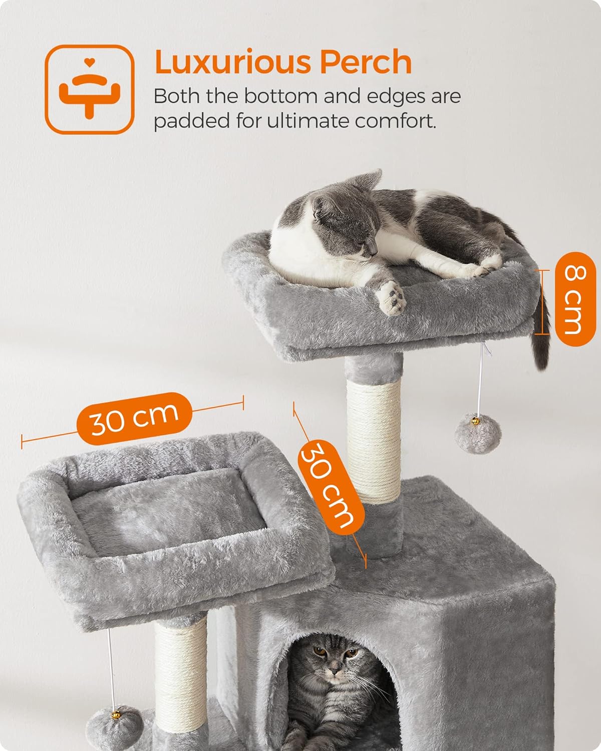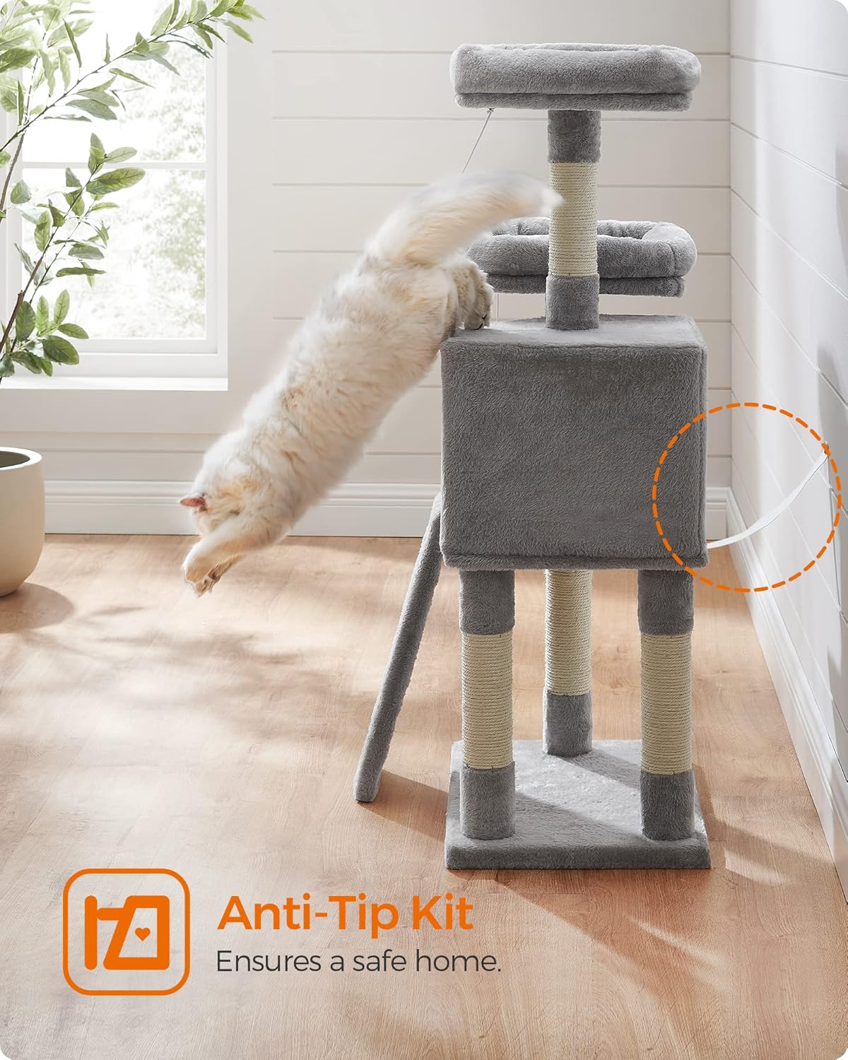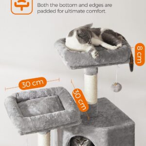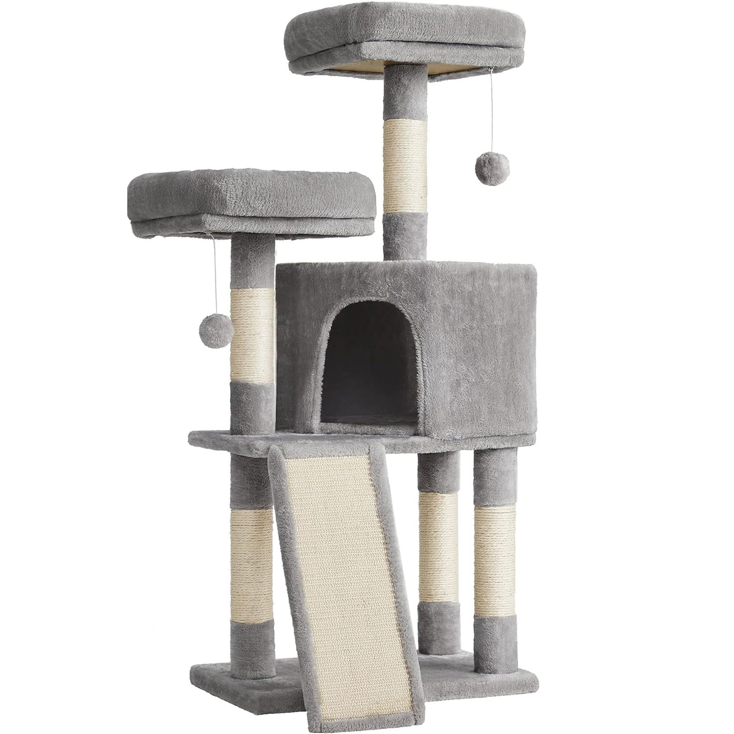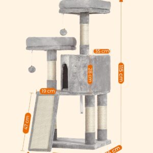 FEANDREA Ansamblu de joaca pisici, tip copac, cu 2 culcusuri si ascunzatoare, 50x35x115 cm, gri deschis