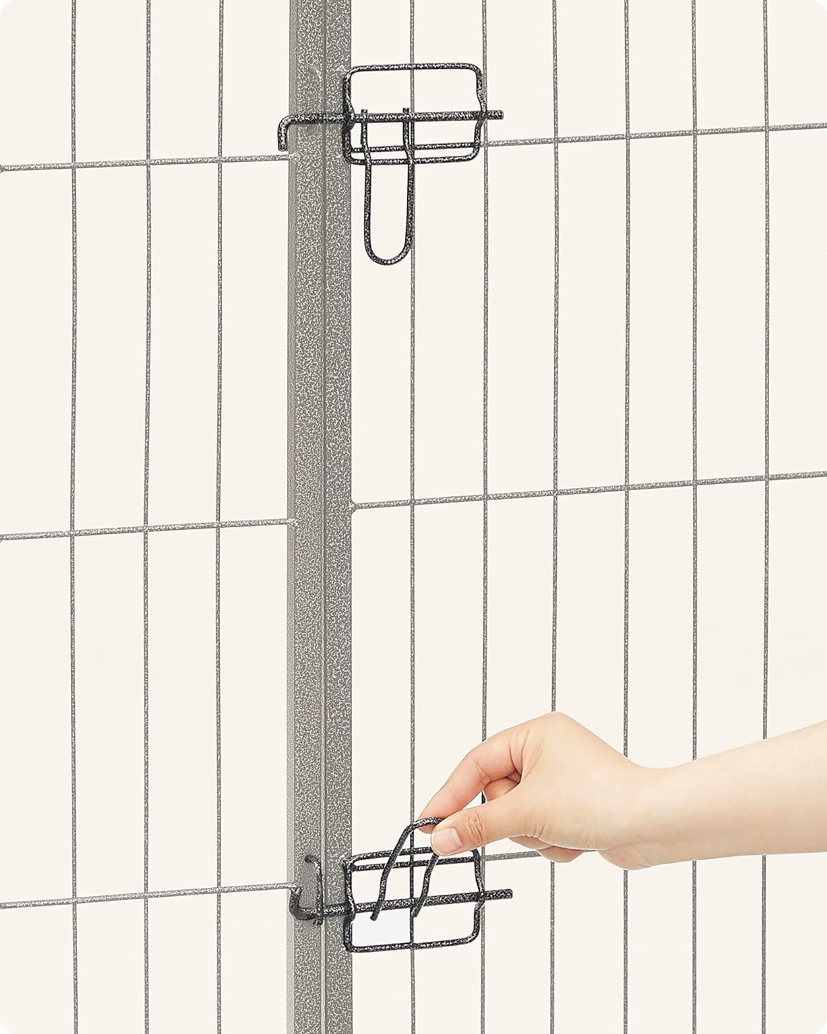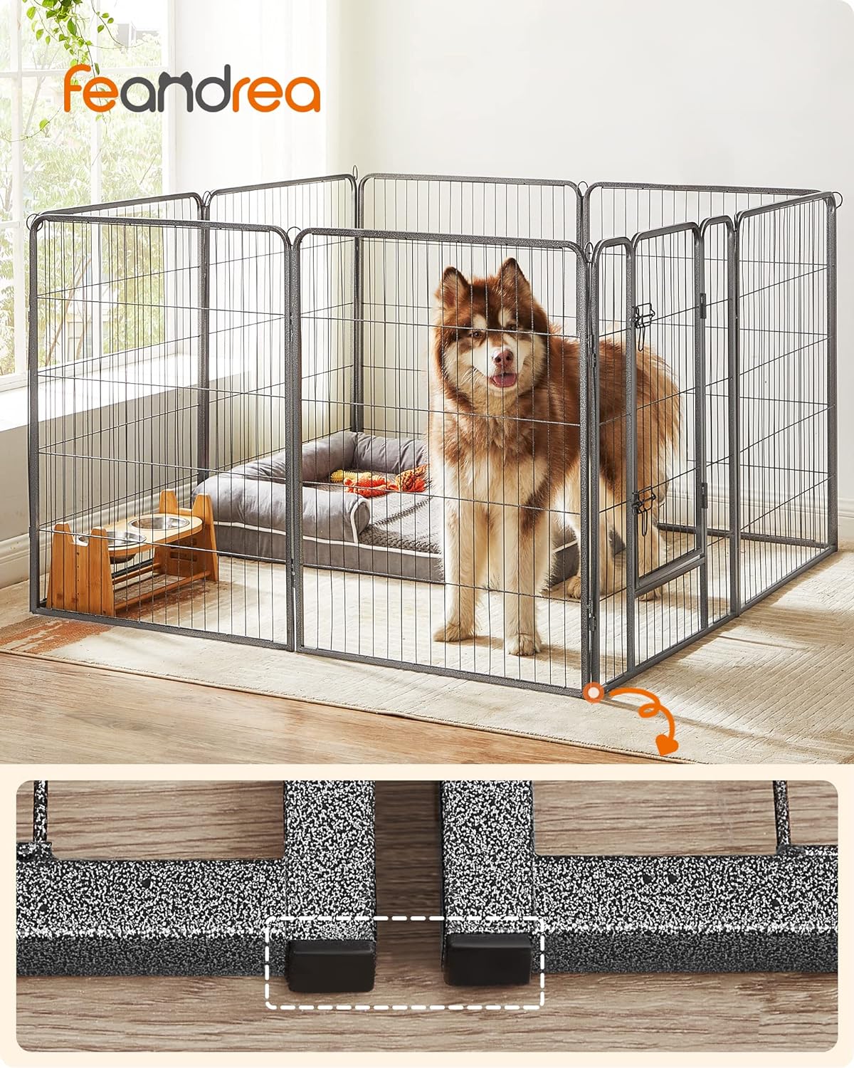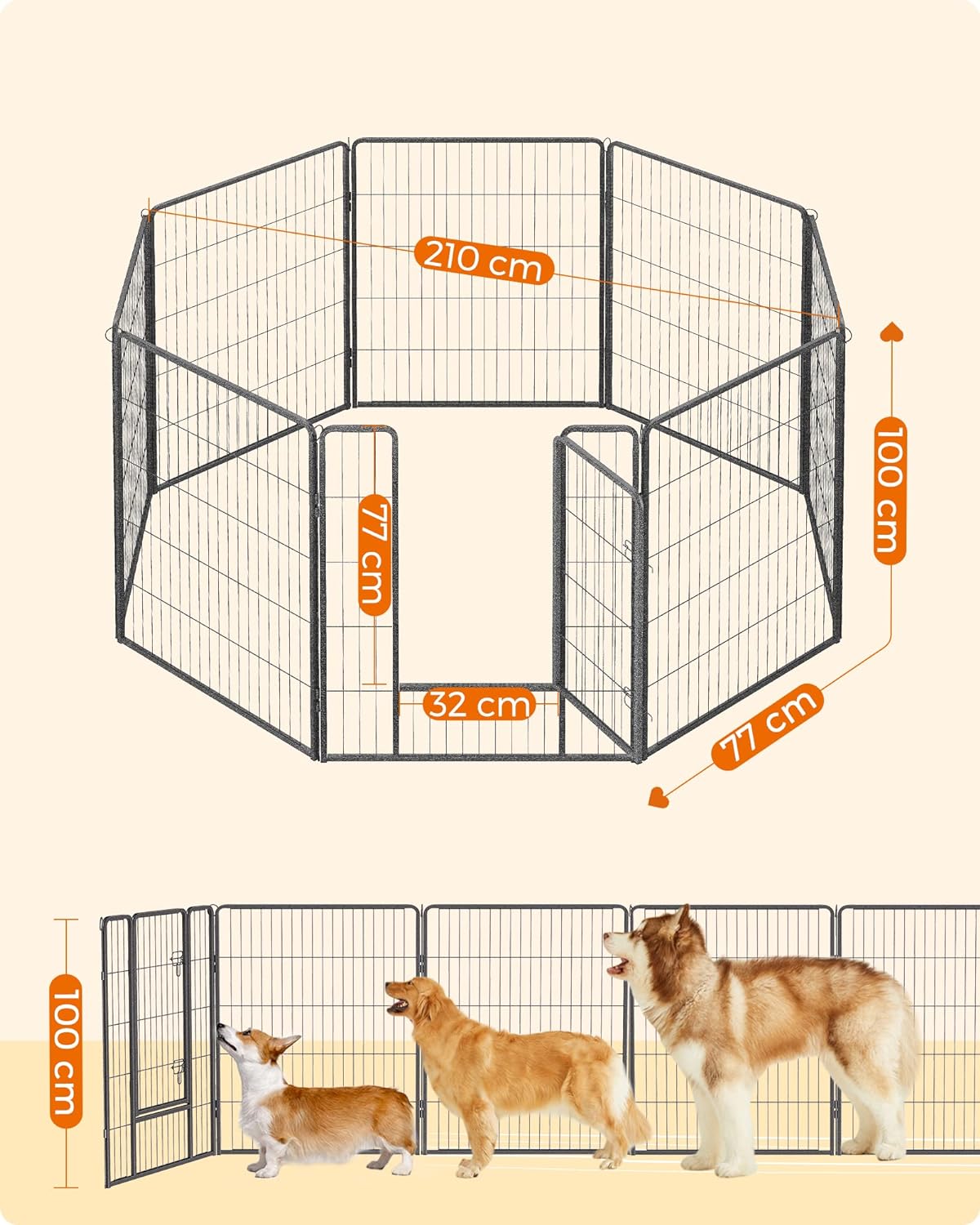 A tömör fémcsövekből készült és padlócsúszkákkal felszerelt kutyajáróka lenyűgözi jó stabilitását. Az összekötő rudak a karámok talajhoz rögzítésére is szolgálnak (ha a kertben használják),