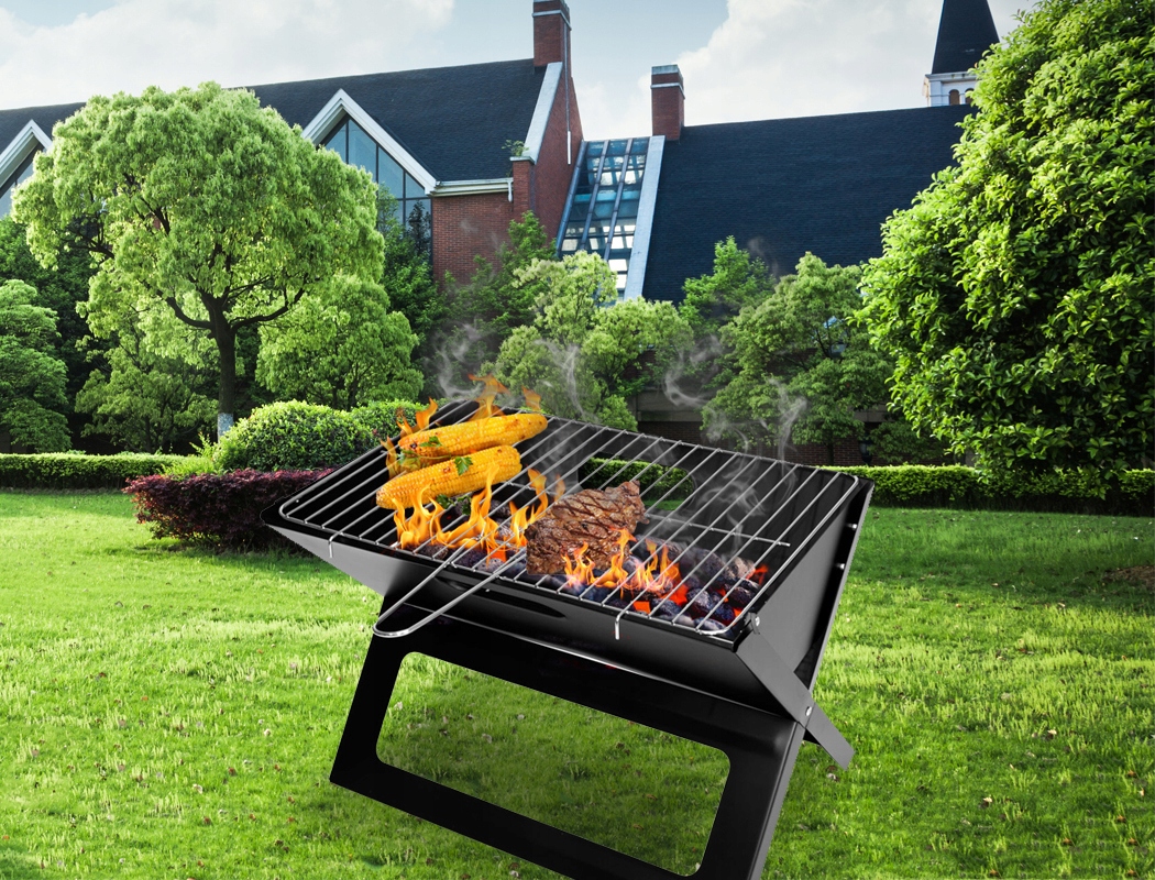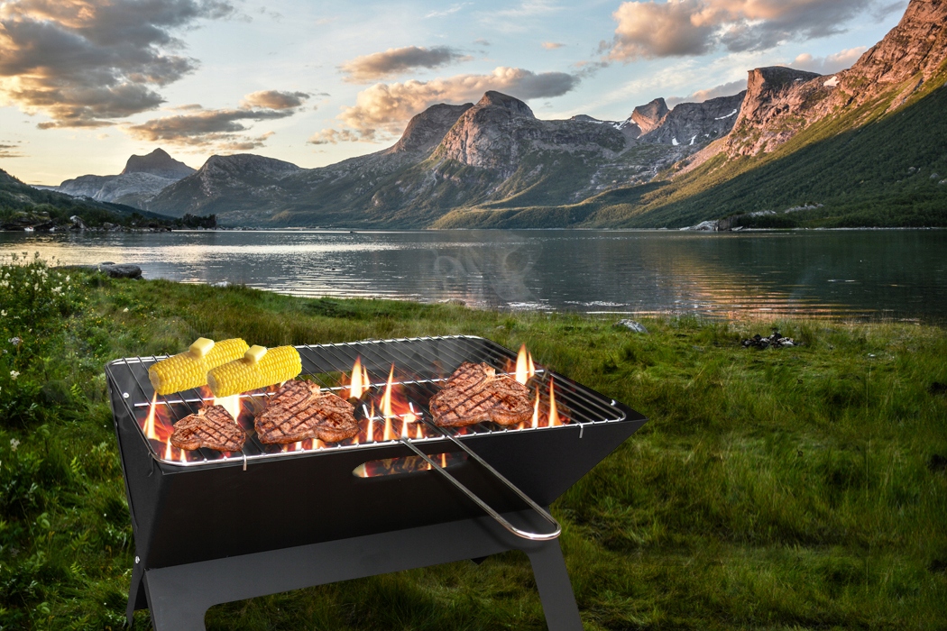 Összecsukható kerti grill. Ellenáll az időjárási viszonyoknak. Masszív felépítés, kiváló minőségű felhasznált anyagok. Acél, króm rács,