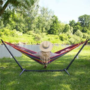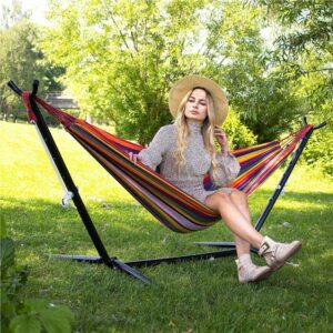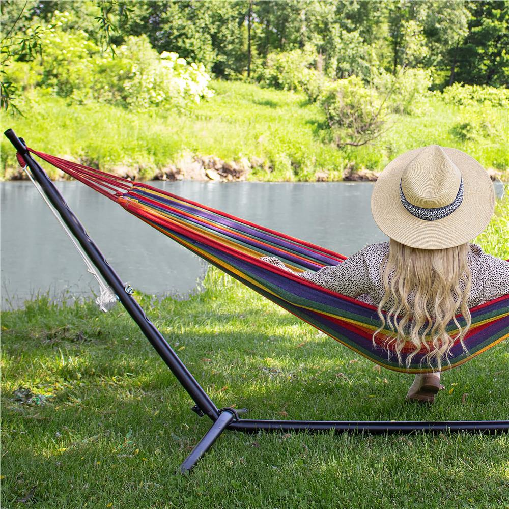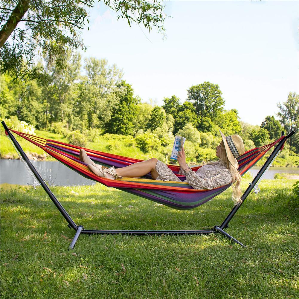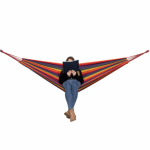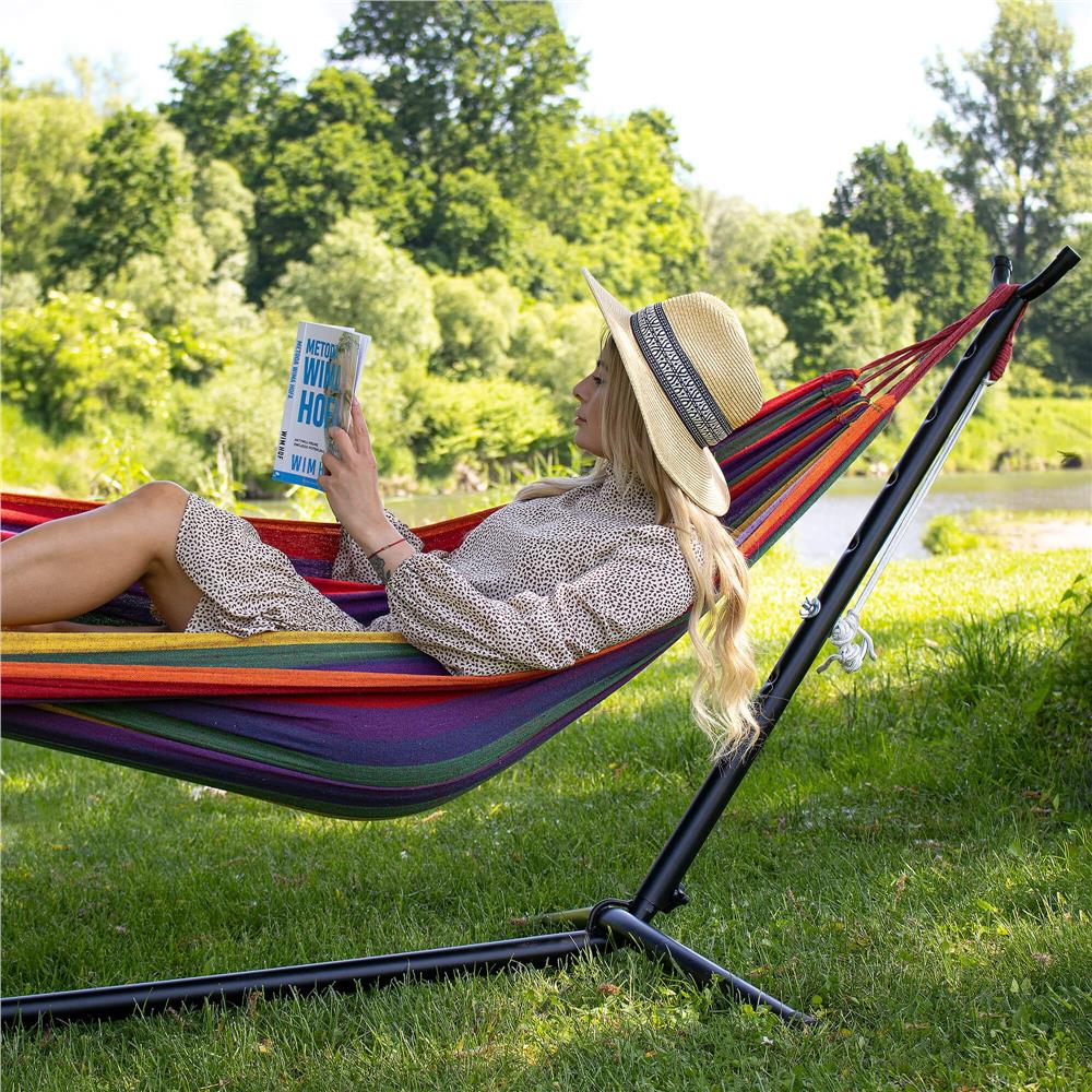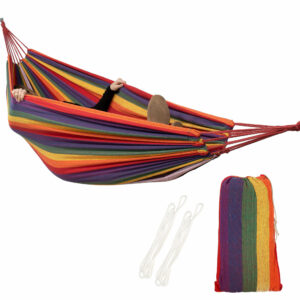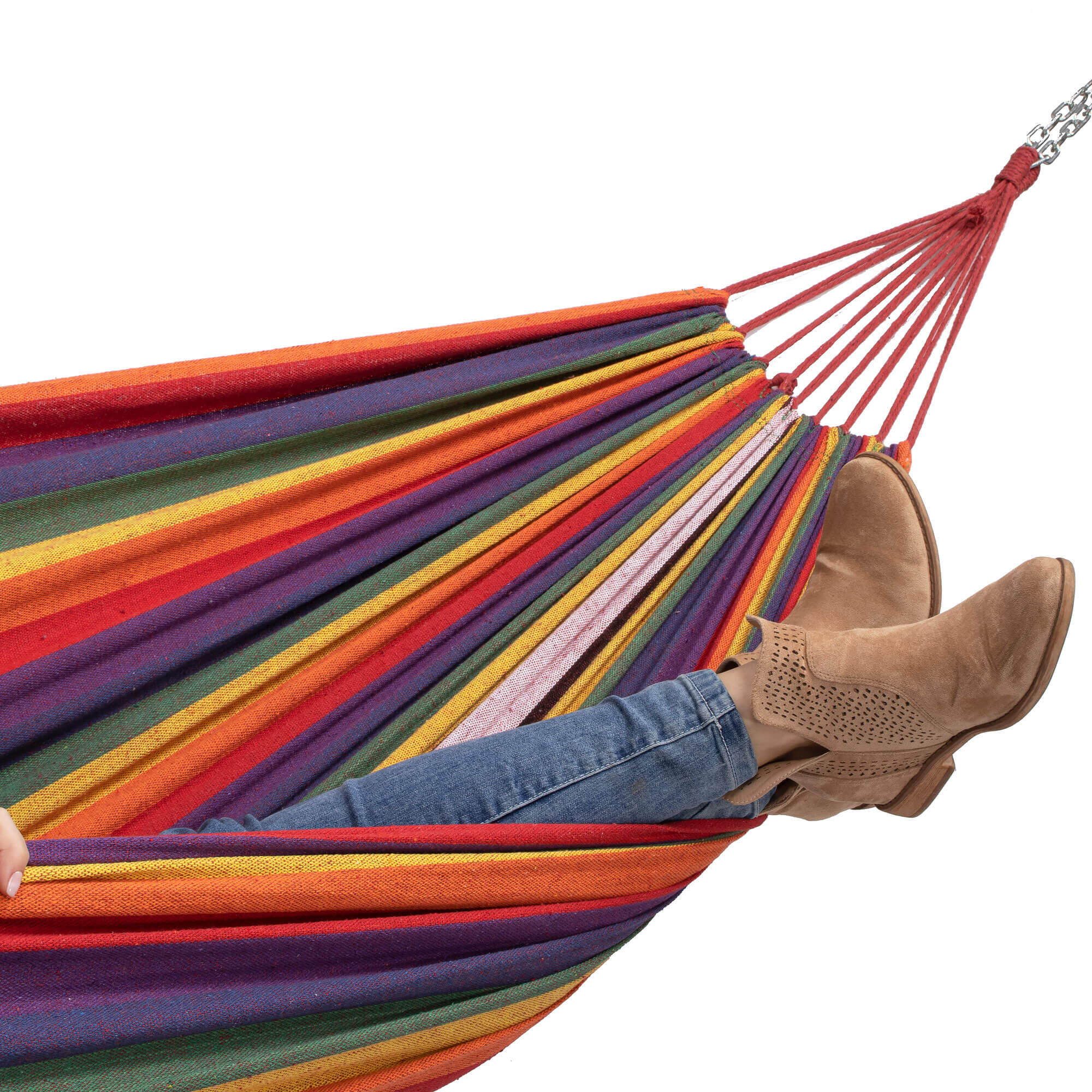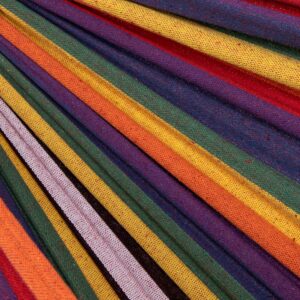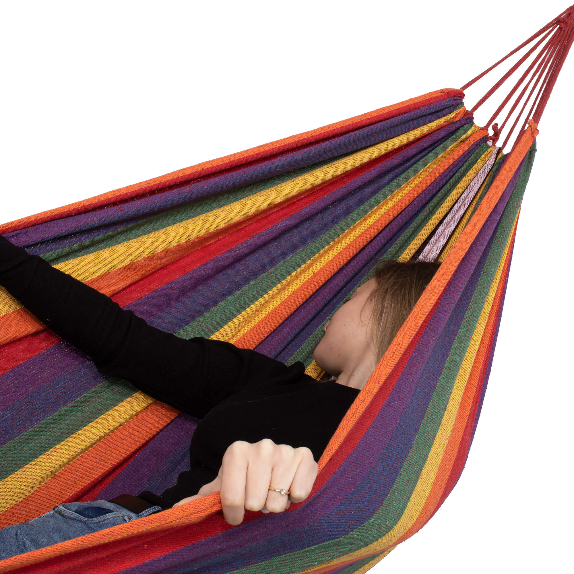 Hamac dublu din bumbac 100%, prelucrat minim numai pentru rezistenta si vopsit cu culori de tip Colourfast. Acest hamac va invita sa va petreceti noptile intr-un confort deosebit impreuna cu partenerul dumneavoastra.