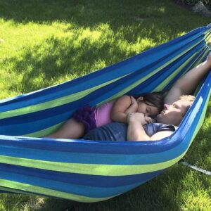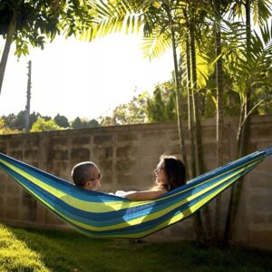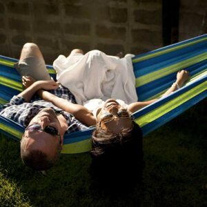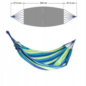 Un hamac de gradina mare si confortabil. Datorita suprafetei mari, doua persoane se pot intinde pe hamac. Un hamac este o piesa de mobilier unica care, mai presus de toate, ar trebui sa fie confortabila si durabila. Potrivirea perfecta a materialului de inalta calitate este cea care ne va invalui corpul si ne va oferi un sentiment de siguranta in timp ce ne odihnim. Un hamac de gradina este lucrul perfect pentru toti cei carora le place sa-si petreaca timpul liber in sanul naturii. Doar legati cele doua capete ale hamacului de copaci sau stalpi robusti si bucurati-va de confort. Puteti, de exemplu, sa cititi o carte in timp ce va leganati usor intr-un hamac moale.