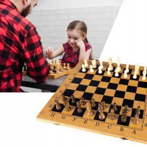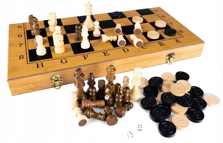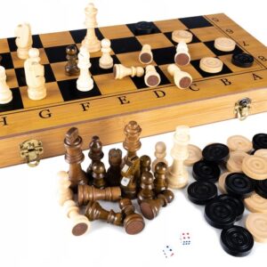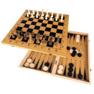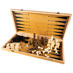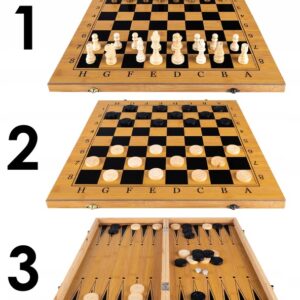 Egy készlet sakk-, dáma- és backgammon-játékhoz. Tartalmaz egy fából készült sakktáblát, valamint egy sor gondosan megmunkált sakkfigurát és táblafigurát. A sakk a legnépszerűbb társasjáték a világon. Fejleszti a logikus gondolkodást és egyben szórakoztatást is nyújt. A retesszel zárt doboz kis helyet foglal összecsukva és könnyen tárolható. A sakkozás a legjobb gyakorlat az elmének, nem csak a felnőtteknek.