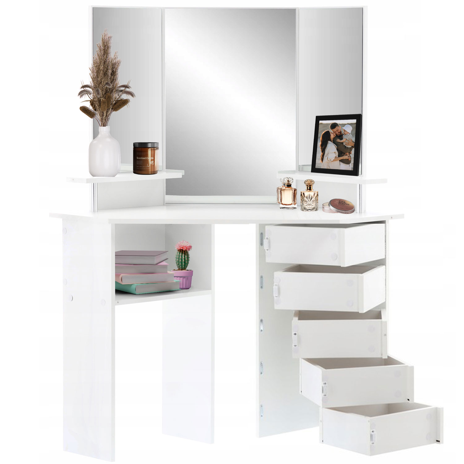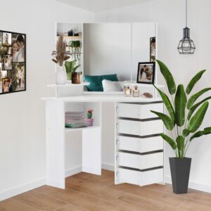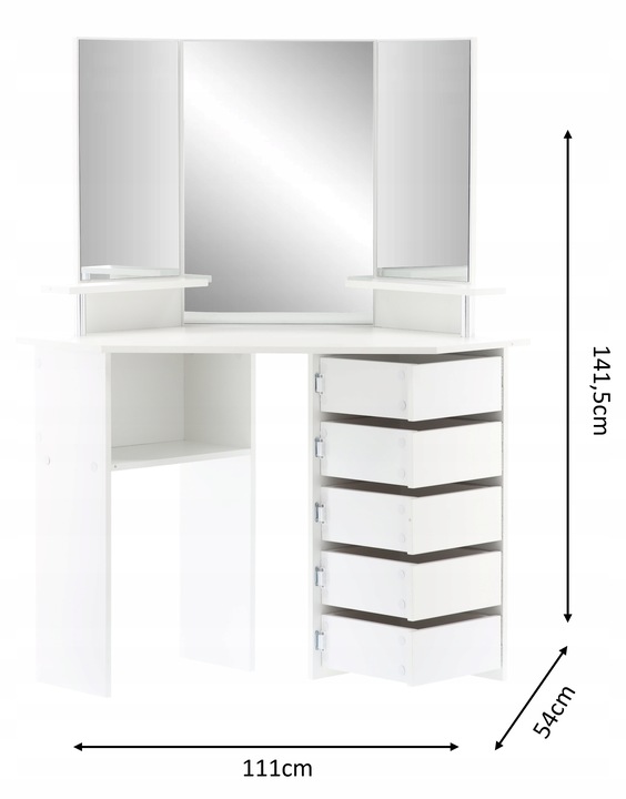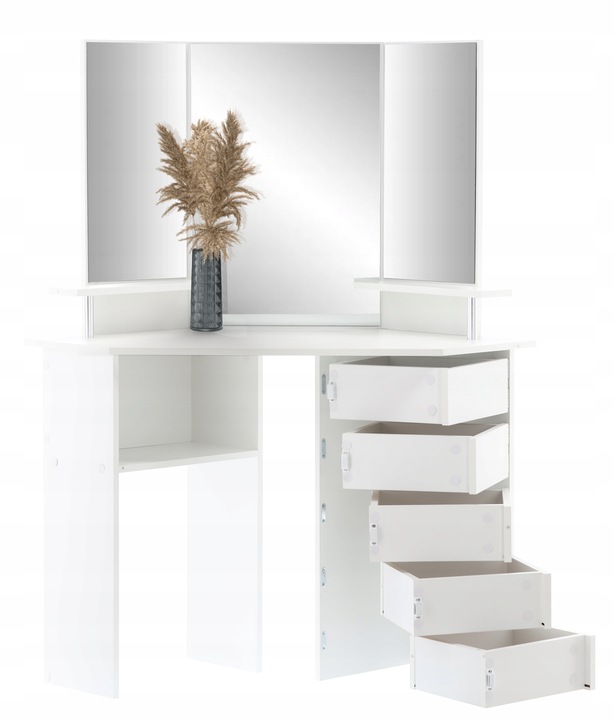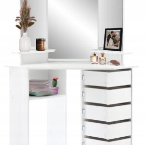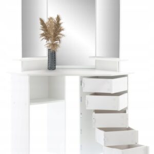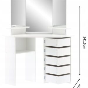 Sarok fésülködőasztal, tükörrel és polcokkal, 5 praktikus fiók zsanérokkal, 111x54x142cm, fehér