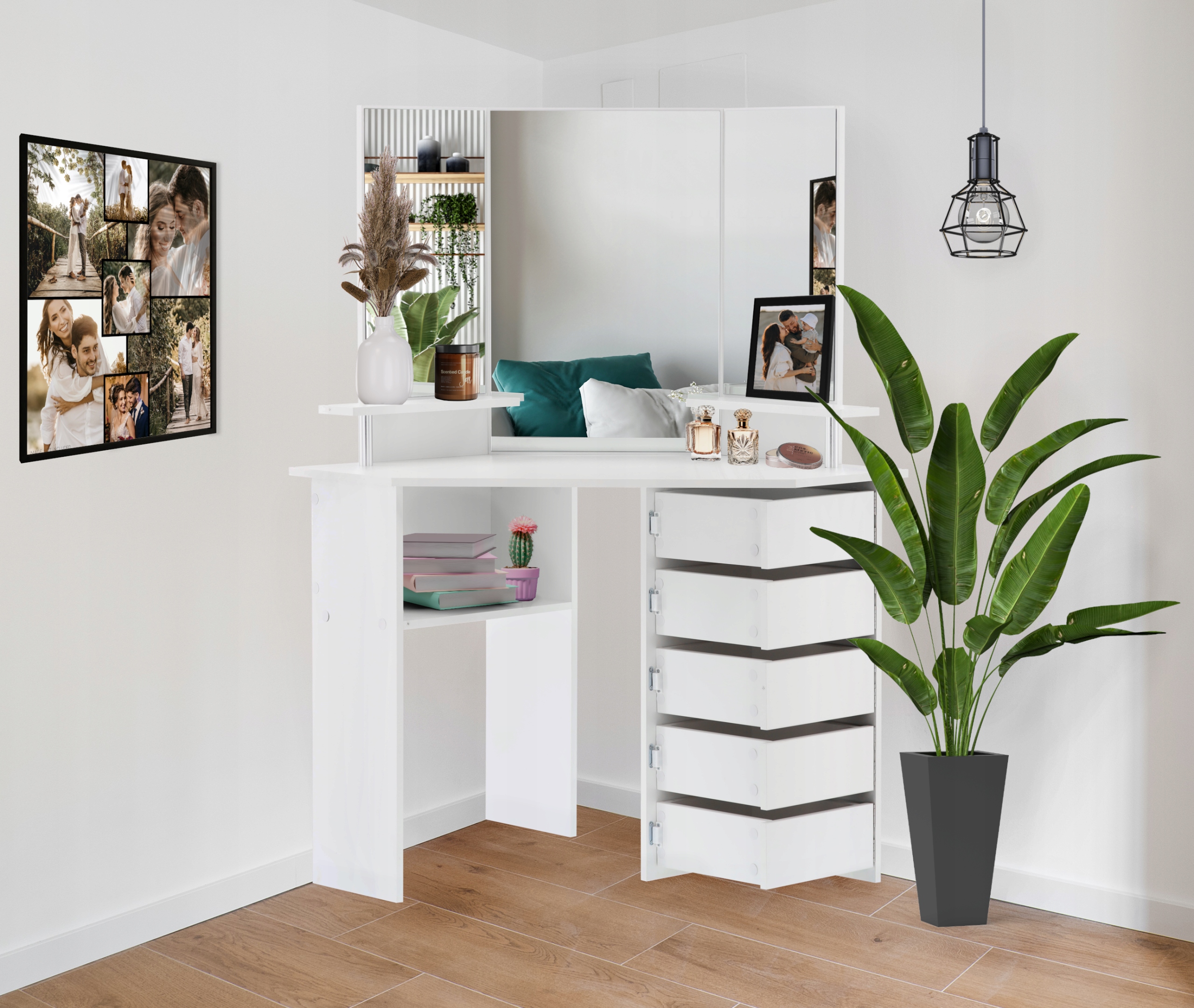 A fehér sarok kozmetikai fésülködőasztal tükörrel egy elegáns és praktikus megoldás, amely tökéletesen illeszkedik a modern fürdőszoba vagy hálószoba berendezéseihez. Funkcionalitást és esztétikát kínál, miközben kényelmes teret biztosít a napi ápolási rituálékhoz.