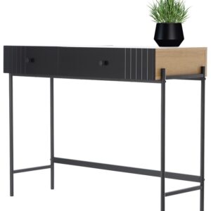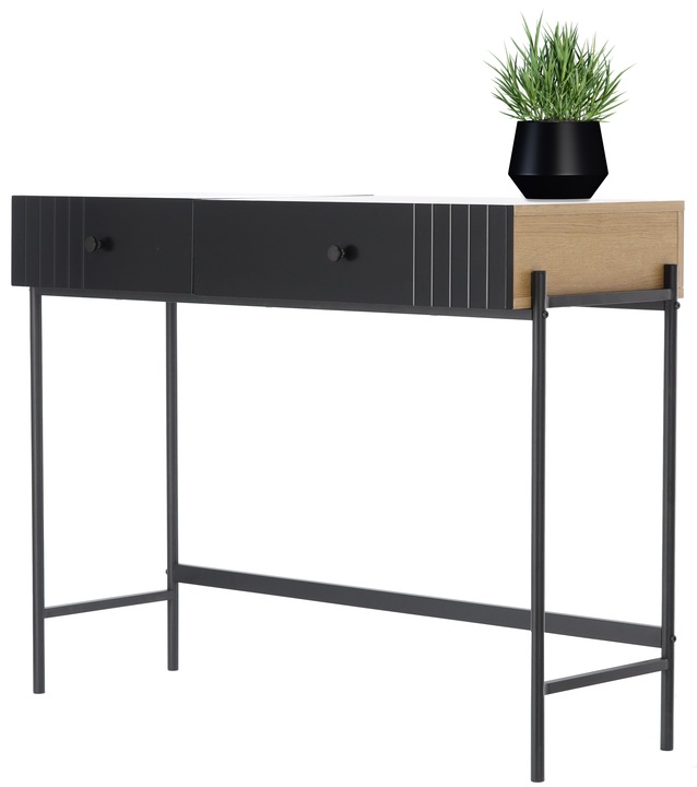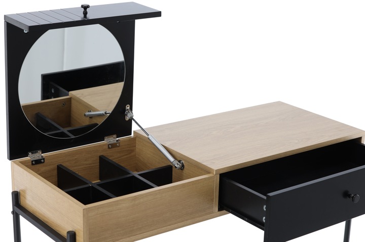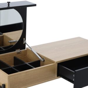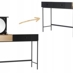 A kiváló minőségű anyagokból, például rostlemezekből (PB), melaminlemezből, fémből és üvegből készült fésülködőasztal garantálja a tartósságot és az esztétikát. A fekete és a fa bevonat kombinációja retró jelleget kölcsönöz a bútornak, amely tökéletesen illeszkedik a különböző belső stílusokhoz.