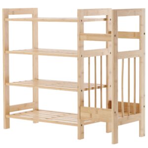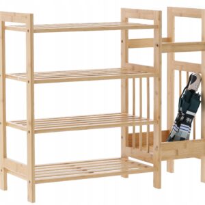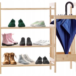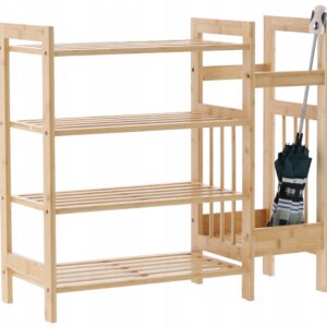 A 4 szintes bambusz cipőtartó egy további oldalsó polccal az esernyők számára elegáns és funkcionális megoldás cipők és esernyők tárolására. A kiváló minőségű bambuszból készült polc a természetes varázst a tartóssággal ötvözi.