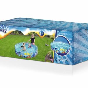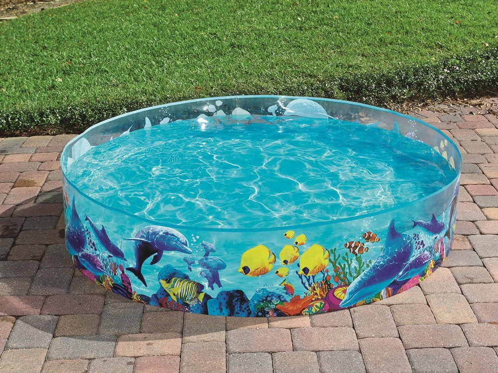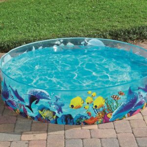 Aceasta piscina este robusta si durabila si este realizata dintr-un perete lateral din PVC rigid, rezistent, atasat permanent la o podea din vinilin rezistenta. Are o capacitate de pana la 950 L de apa. Peretii transparenti cu grafica interesanta a unui recif de corali colorat creeaza un efect vizual deosebit.