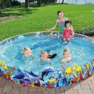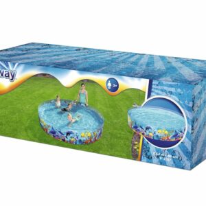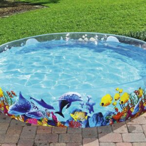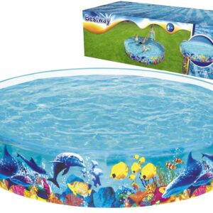 Aceasta piscina este robusta si durabila si este realizata dintr-un perete lateral din PVC rigid, rezistent, atasat permanent la o podea din vinilin rezistenta. Are o capacitate de pana la 950 L de apa. Peretii transparenti cu grafica interesanta a unui recif de corali colorat creeaza un efect vizual deosebit.
