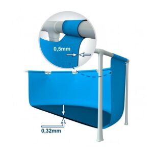 Piscina poate fi montata rapid si usor. Materialele cu 3 straturi rezistente la strapungere asigura o rezistenta si o durabilitate sporita piscinei. Cadrul de otel robust garanteaza o constructie stabila. De asemenea, este usor de intretinut si depozitat, cand nu este utilizata. Luati acasa aceasta piscina si bucurati-va de o dupa-amiaza frumoasa de vara impreuna cu familia dumneavoastra!