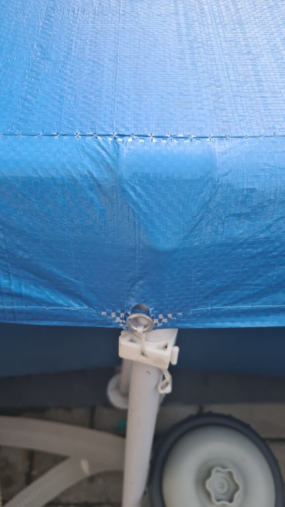 Aceasta prelata de piscina are orificii de scurgere, pentru a preveni acumularea apei pe suprafata ei.