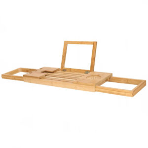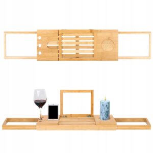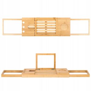 A polc szélesség állítási funkcióval rendelkezik 50 cm – 93 cm tartományban, aminek köszönhetően a legtöbb esethez igazítható. A polc tágas, elfér benne kozmetikumok, fürdőszobai kiegészítők, valamint telefon vagy olvasnivaló. A termék a legjobb minőségű természetes bambuszból készült, ami tartóssá teszi. Lakkozott felülete pedig növeli a víz- és penészállóságát. Univerzális kialakításának és funkcionalitásának köszönhetően tökéletesen illeszkedik bármely fürdőszoba dekorációjához.