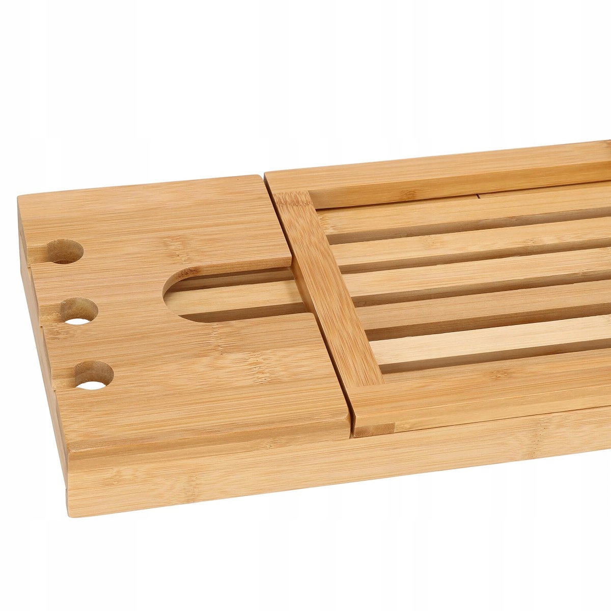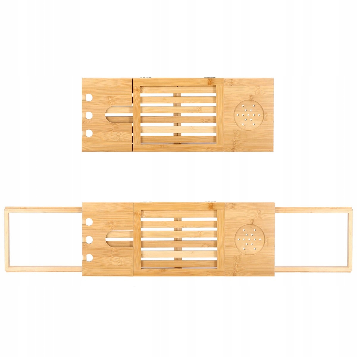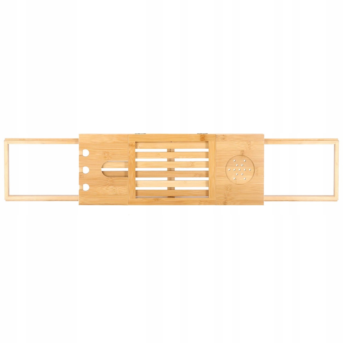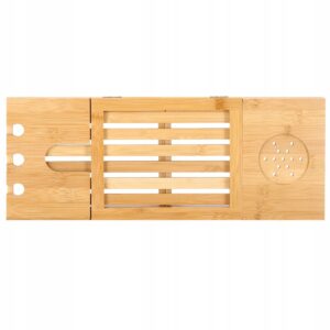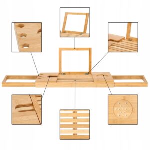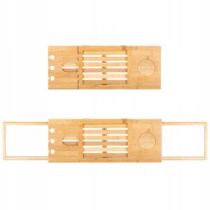 szélesség állítás 50-93 cm tartományban (a kádhoz igazodik) funkcionalitás és kényelem természetes, tartós bambusz lakkozott felület a nagyobb vízállóságért és penészesedésért esztétikus megjelenés (minden fürdőszoba dekorációhoz tökéletes) borospohártartó tabletta vagy könyvtartó három lyuk egy pohár borhoz vagy pezsgőhöz szellőző alátét például bögréhez, csészéhez vagy dobozhoz