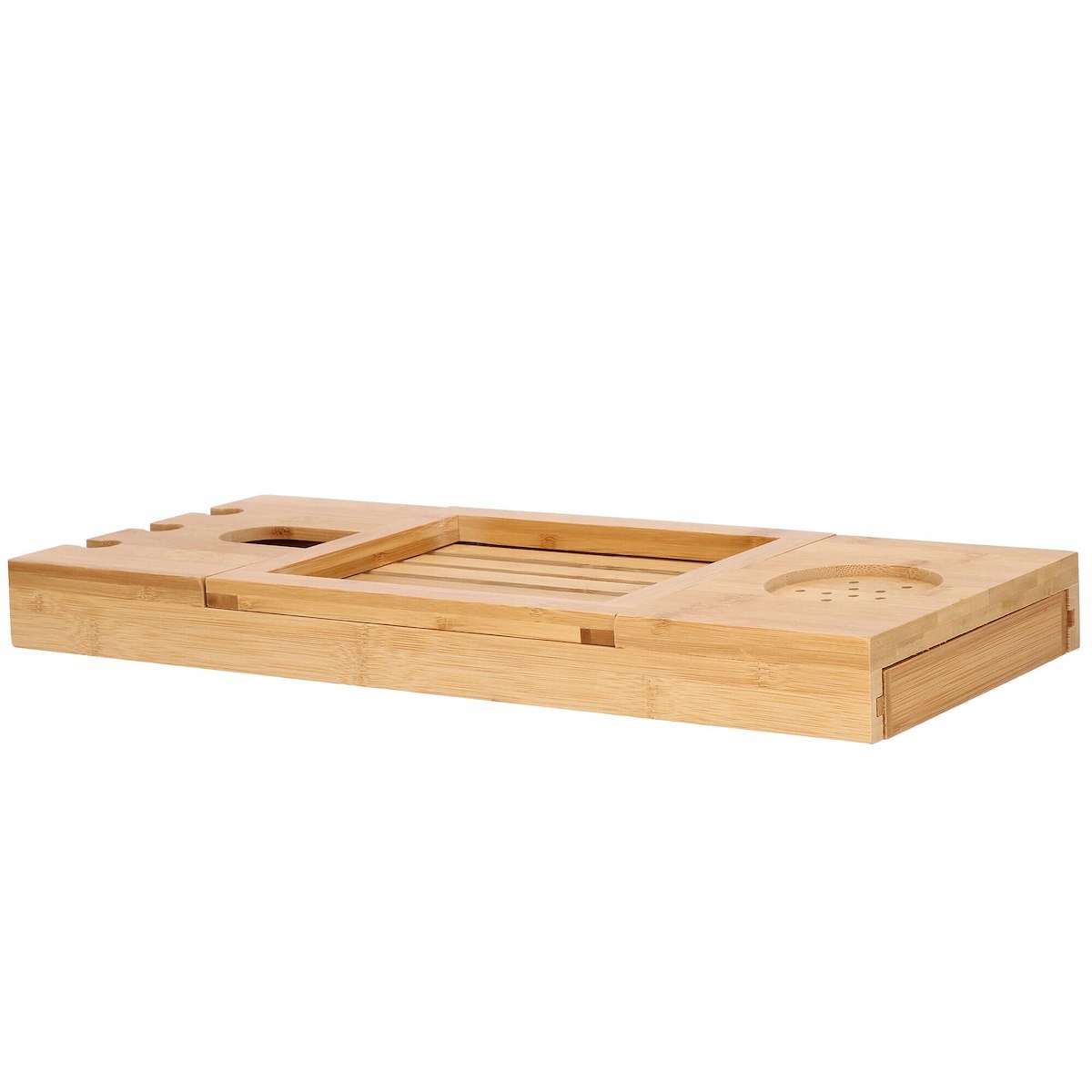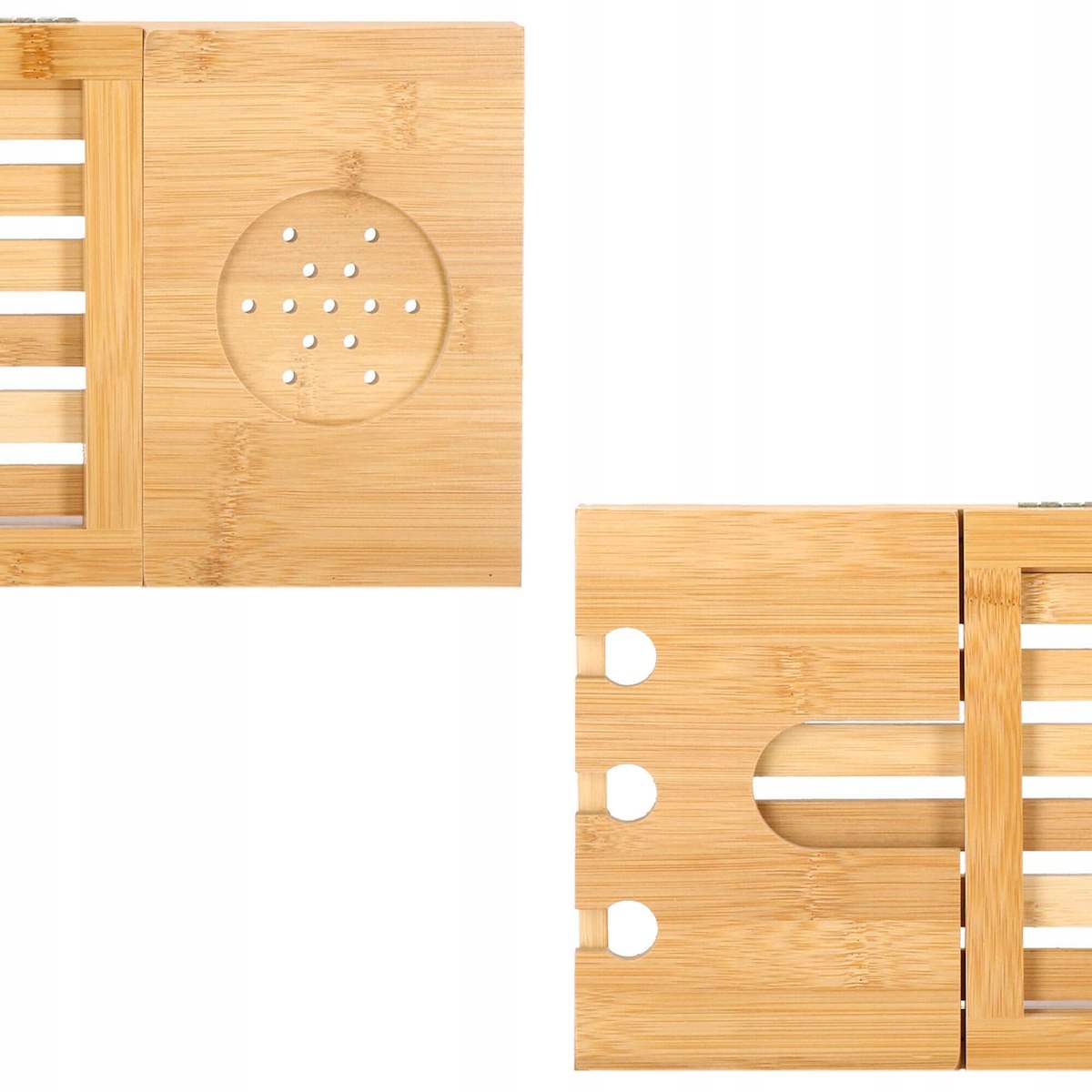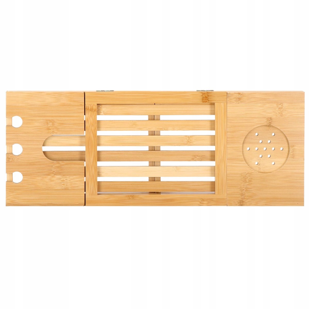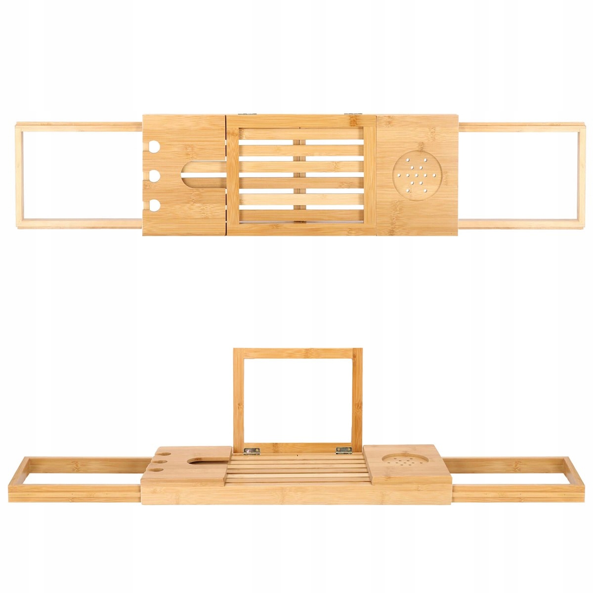 szélesség állítás 50-93 cm tartományban (a kádhoz igazodik) funkcionalitás és kényelem természetes, tartós bambusz lakkozott felület a nagyobb vízállóságért és penészesedésért esztétikus megjelenés (minden fürdőszoba dekorációhoz tökéletes) borospohártartó tabletta vagy könyvtartó három lyuk egy pohár borhoz vagy pezsgőhöz szellőző alátét például bögréhez, csészéhez vagy dobozhoz