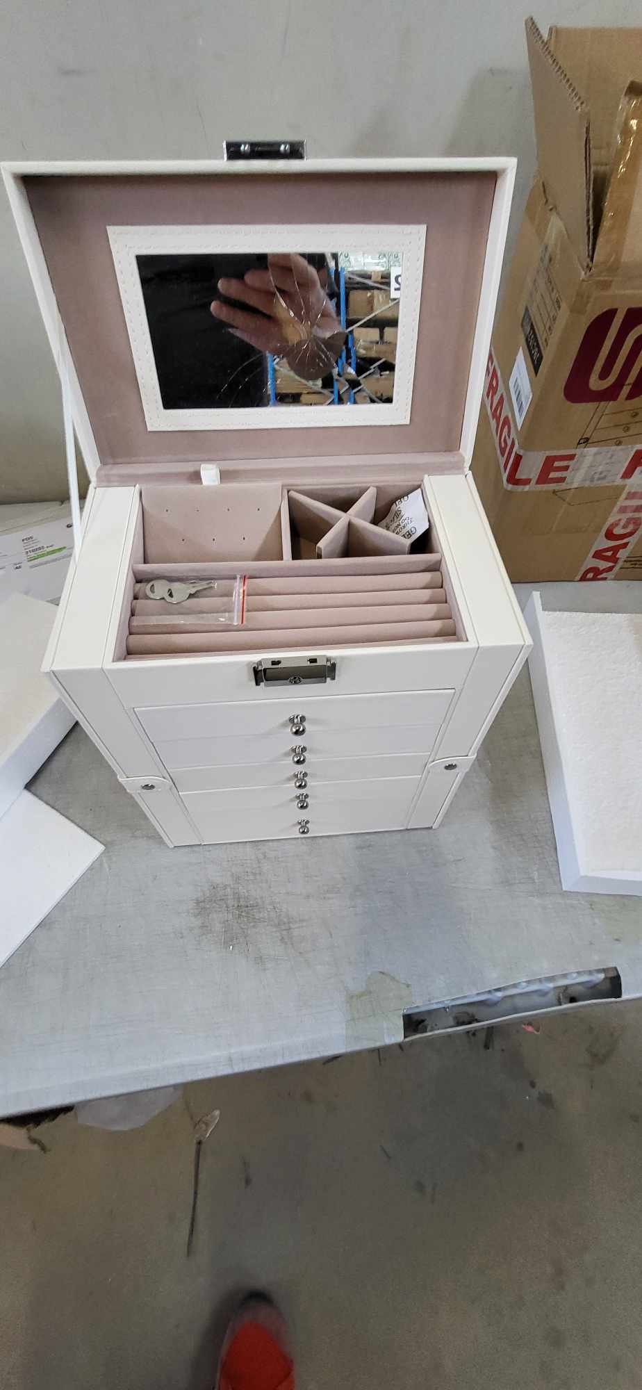 6x niveluri, spatioase: Aceasta cutie de bijuterii cu 6 niveluri are mai multe straturi cu diferite compartimente si aranjamente pentru a va pastra toate bijuteriile, cum ar fi cercei si inele, sortate si organizate; sertarul inferior adanc se potriveste cu 3 ceasuri si o pereche de ochelari de soare.