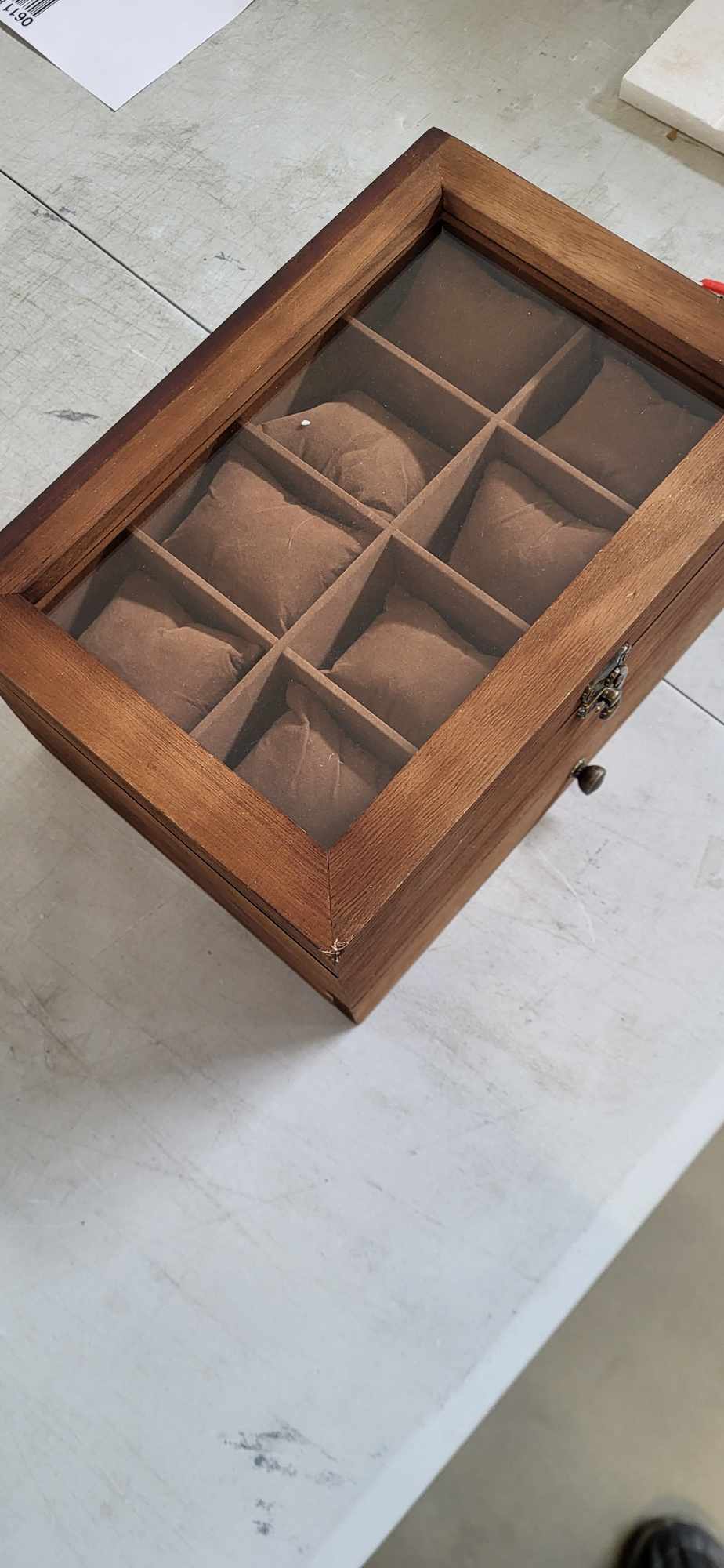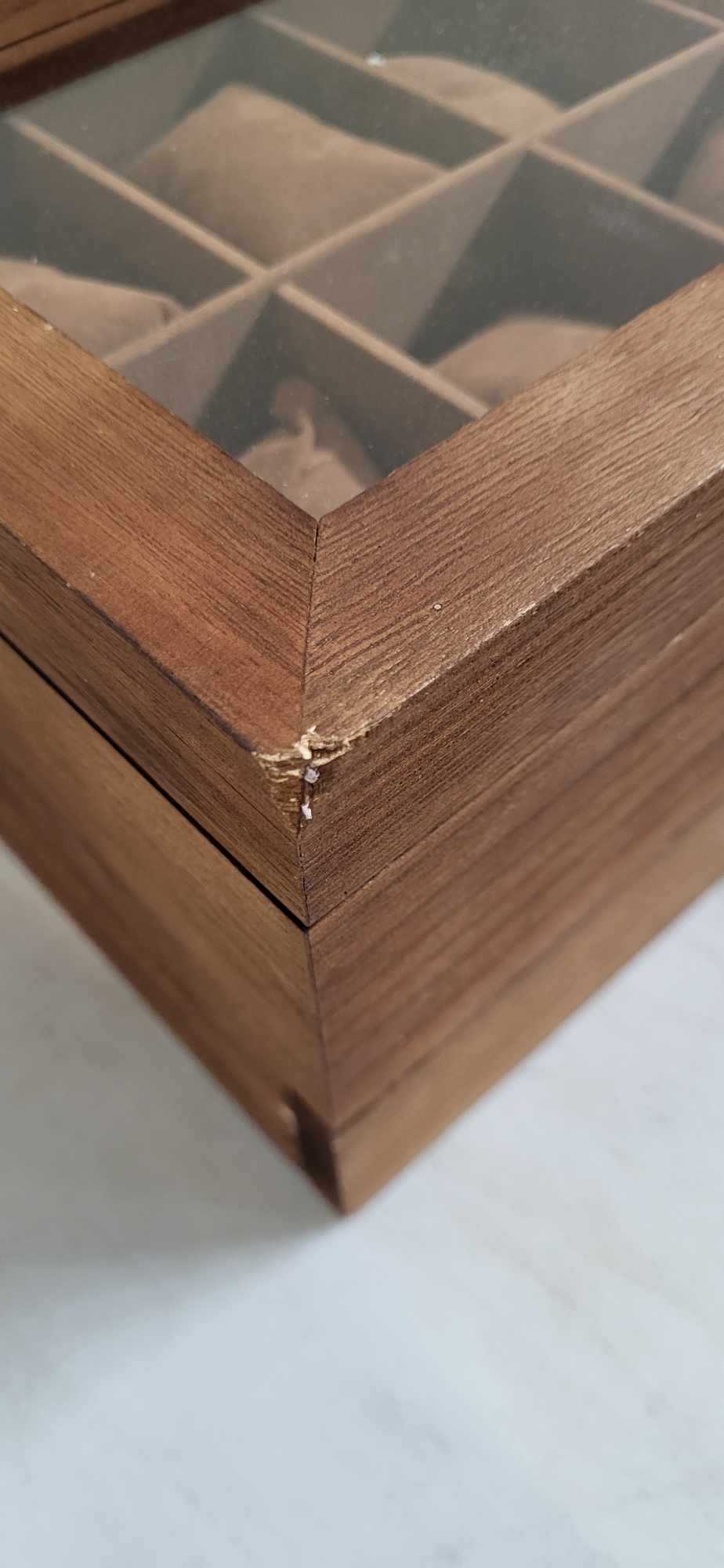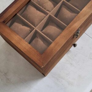 Klasszikus és rusztikus: Gazdag erezetű tömörfa kerettel és nagy átlátszó üvegborítással ez az óraállvány nem csak tárolási eszköz, henem egyben egy stílusos dekoratív elem, mely kiemeli az óra illetve ékszerkolekcíót is.