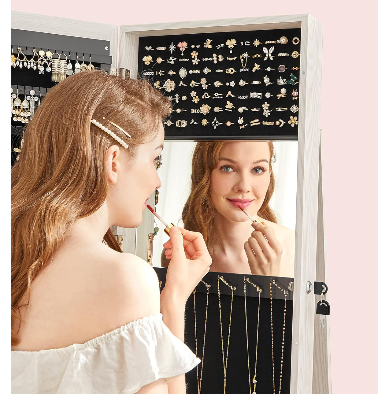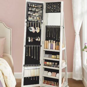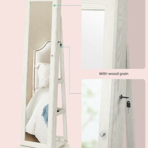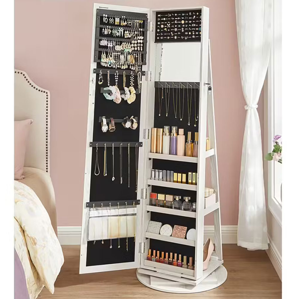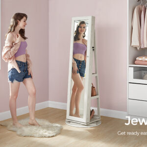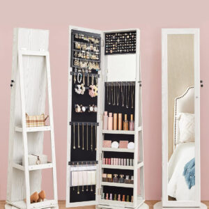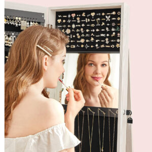 Organizator de bijuterii 3 in 1: Cu o oglinda pe toata lungimea de 26 x 144 cm, un dulap pentru bijuterii si un raft de depozitare pe 3 niveluri, acest organizator va pastreaza bijuteriile, machiajul si gentile intr-un singur loc si va ofera o vizualizare rapida de la cap la picioare.