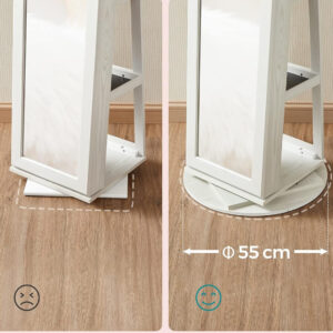 Intoarceti dulapul pentru bijuterii pentru a va verifica tinuta din unghiuri diferite sau intoarceti-l spre spate pentru a avea acces usor la articolele de pe raftul din spate – cu o baza pivotanta mare de 360° cu diametrul de 55 cm, acesta se roteste stabil si fara probleme.
