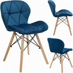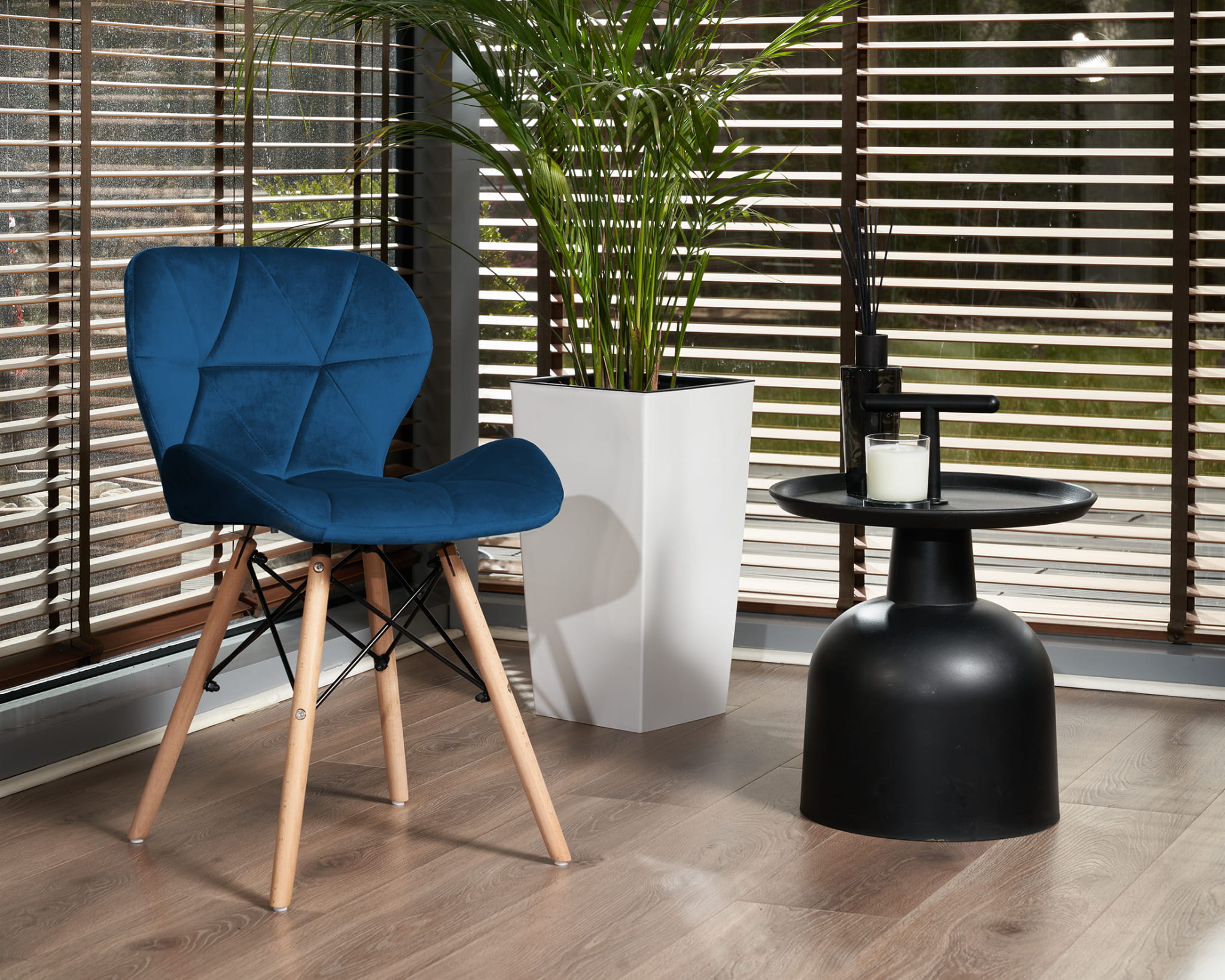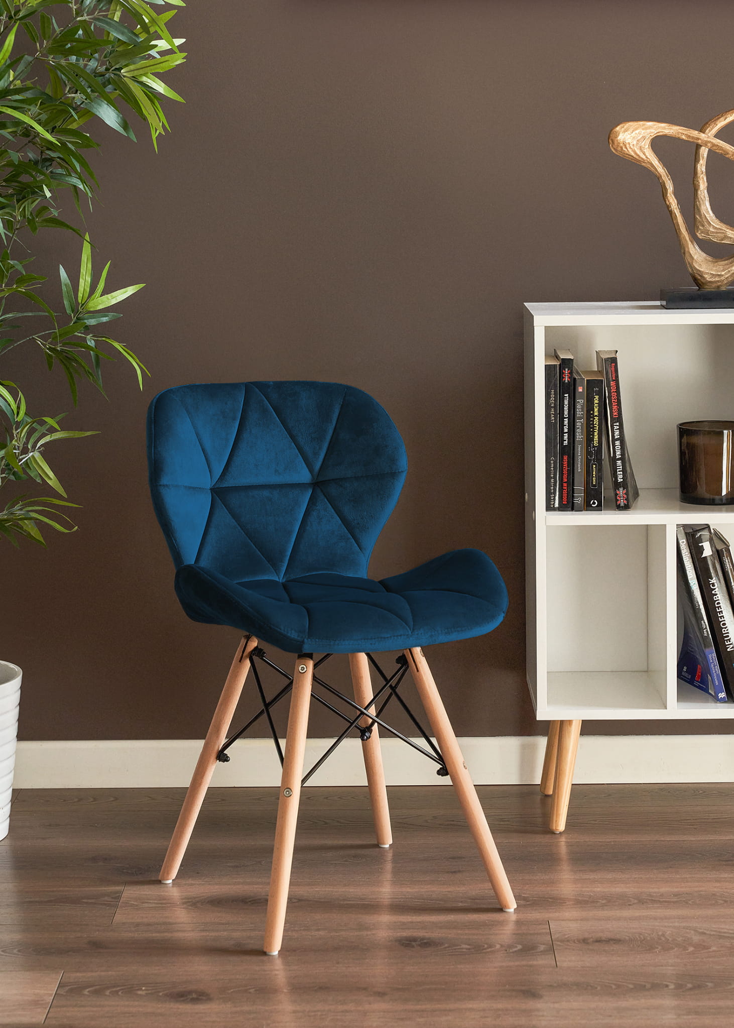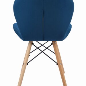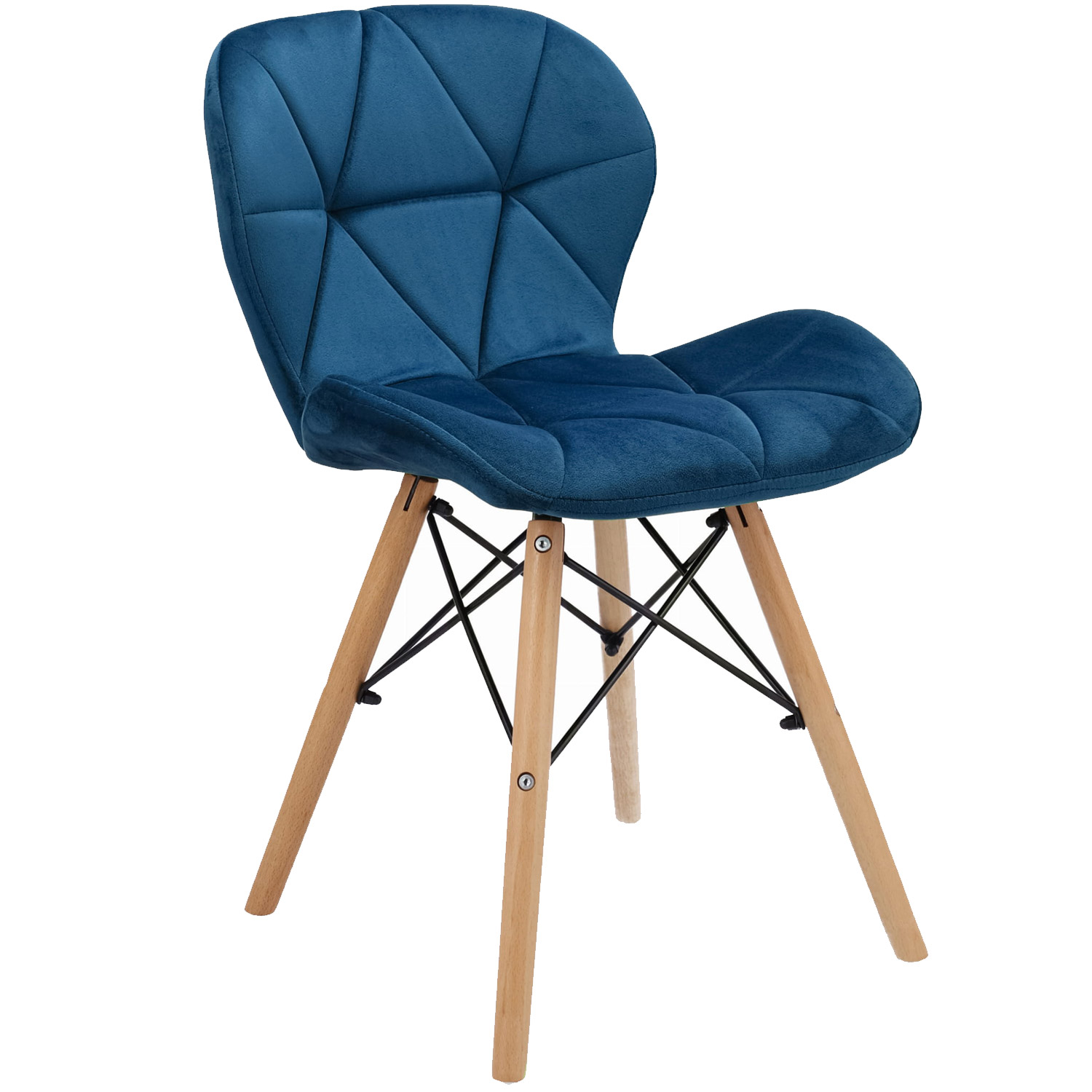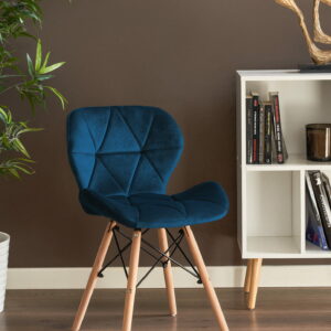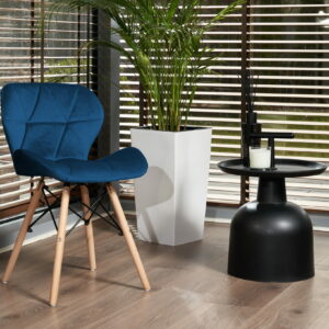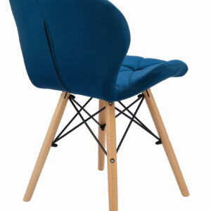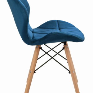 Scaunul are un sezut tapitat cu catifea, cu forme decupate interesante pe partile laterale. Picioarele sunt realizate din lemn masiv natural de fag – asigurand rezistenta si stabilitate in timpul utilizarii, in timp ce imbinarile negre intaresc intregul cadru si sunt, de asemenea, decorative.