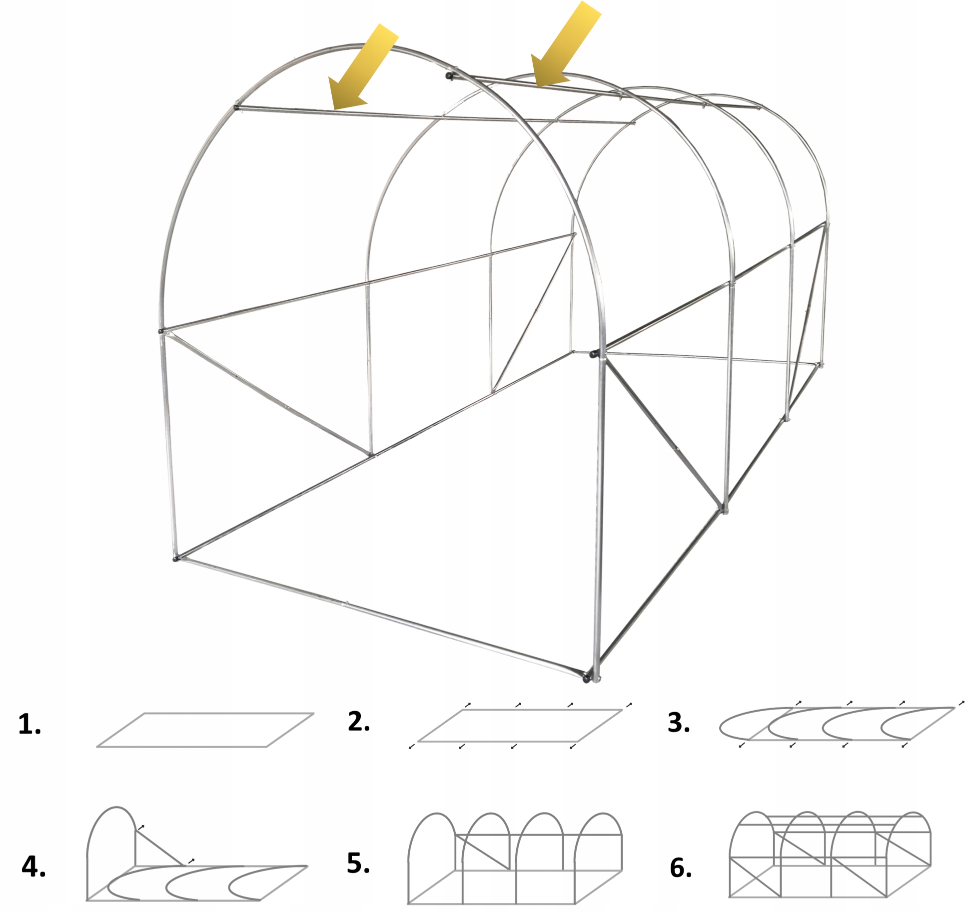 6. lépés Szerelje össze a fennmaradó keresztrudakat és az átlós csöveket. Ha minden alkatrész össze van szerelve, a csavarokat teljesen meghúzhatja. Helyezze a fóliát, és rögzítse az alagutat a talajban.