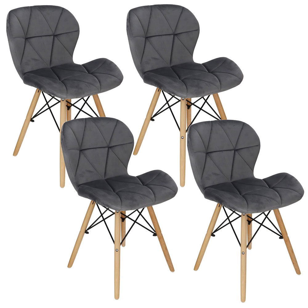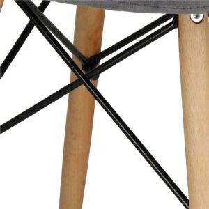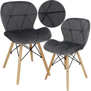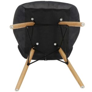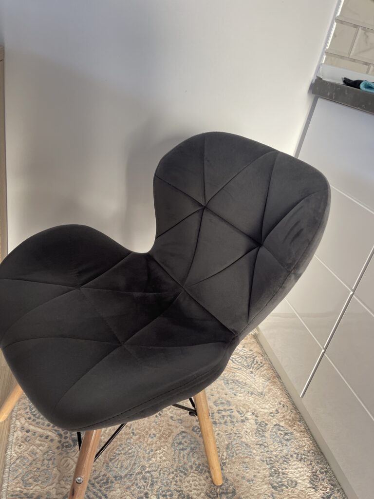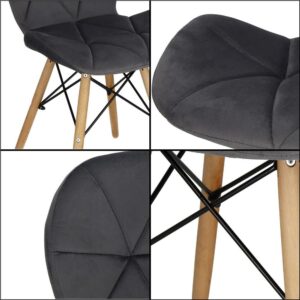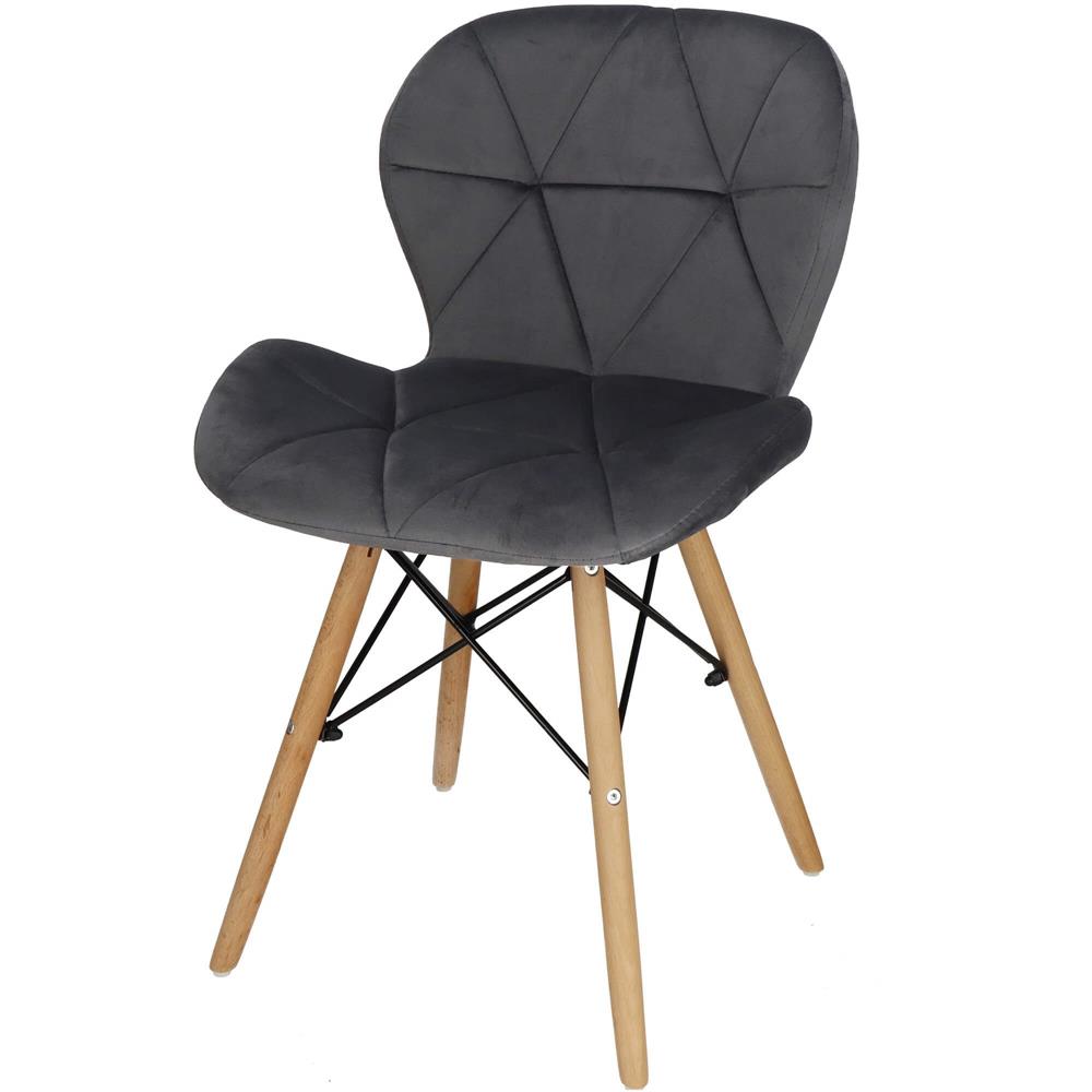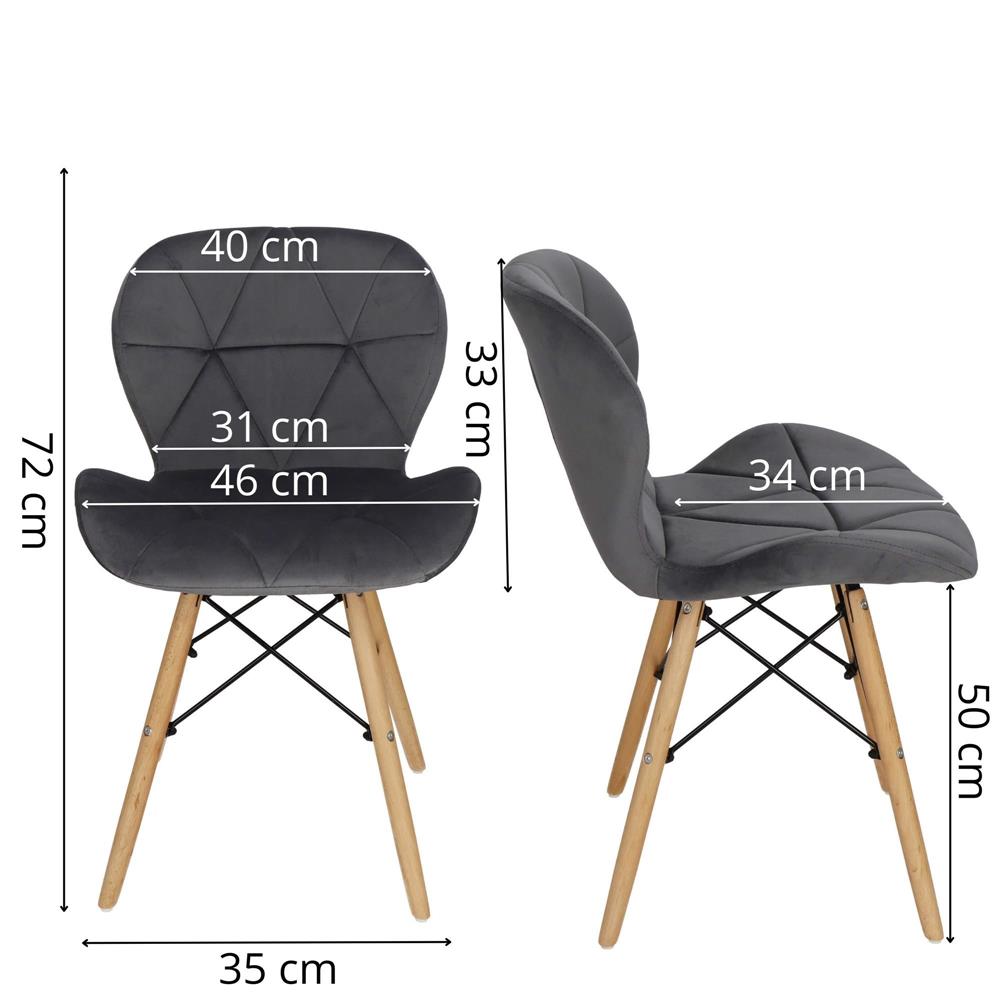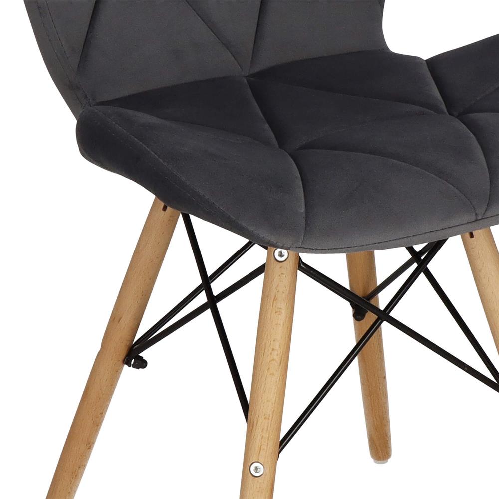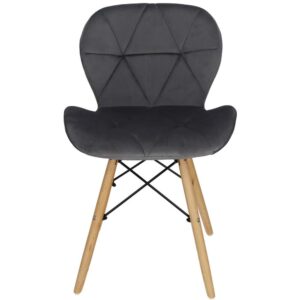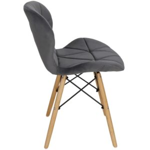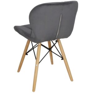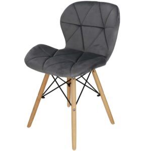 Scaunul are un sezut tapitat cu catifea, cu forme decupate interesante pe partile laterale. Picioarele sunt realizate din lemn masiv natural de fag – asigurand rezistenta si stabilitate in timpul utilizarii, in timp ce imbinarile negre intaresc intregul cadru si sunt, de asemenea, decorative.