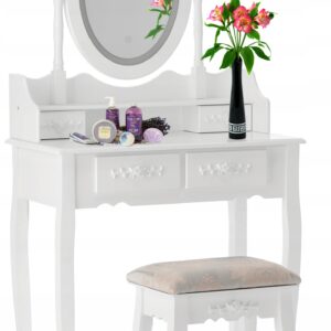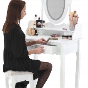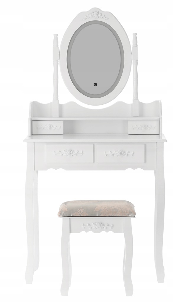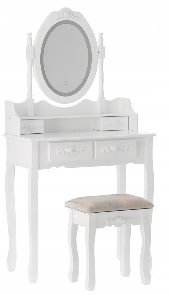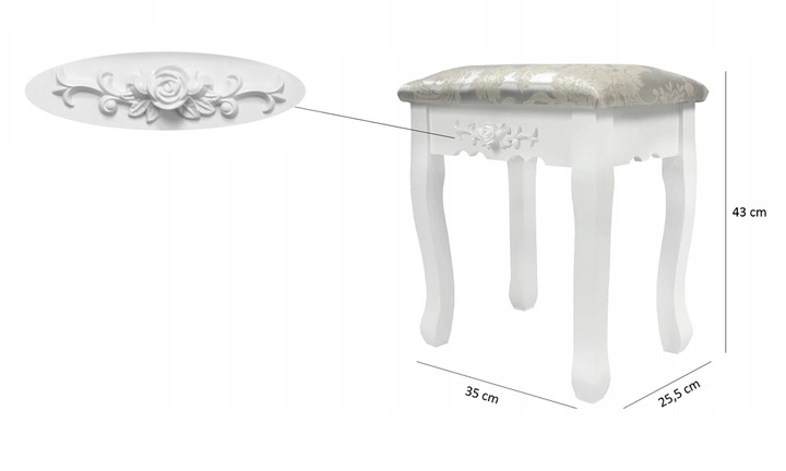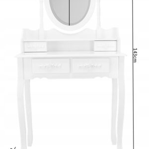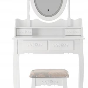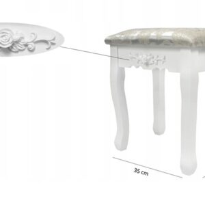 O masa de toaleta eleganta este visul majoritatii femeilor. Este o solutie functionala si practica. Ne permite sa ne depozitam cosmeticele sau bijuteriile preferate – o oglinda potrivita, comoditate in utilizare si confortul de a avea la indemana toate articolele necesare. Canelurile delicate il fac perfect pentru stilul vintage si shabby chic. Setul include, de asemenea, un taburet confortabil, tapitat cu un model floral, care va adauga farmec si eleganta incaperilor dvs.