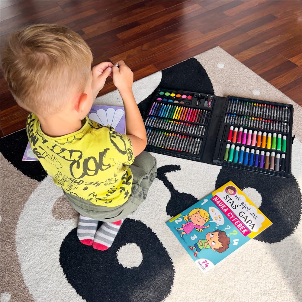 Setul de arta este ascuns in intregime in valiza, care a fost produsa in mod estetic. Copilul mic o poate lua cu incredere cu el oriunde cu ajutorul manerului de transport. La gradinita, la bunici, in vacanta sau chiar in aer liber.
