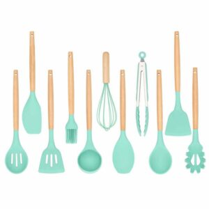 Sersimo készlet 12 hőálló szilikon konyhai edényből és bambusz fogantyúból, zöld