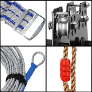 Carligele noastre pentru copii au manere antiderapante care asigura o prindere sigura si reduc la minimum riscul de alunecare. Arcurile speciale de la capatul franghiei amortizeaza impactul la finalul toboganului, asigurand o oprire moale si sigura pentru copil. Creat din materiale de inalta calitate, setul minimizeaza riscul de deteriorare mecanica.
