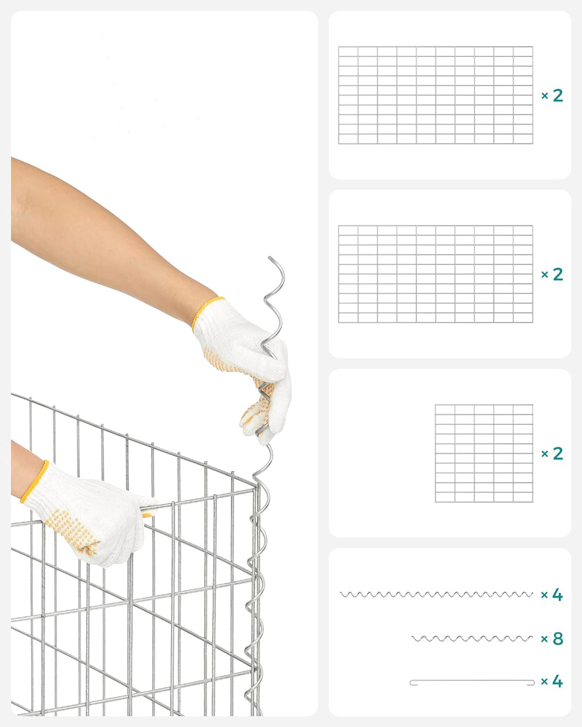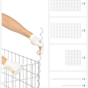 Nu este nevoie de scule pentru a asambla aceasta cusca de gabioane metalice! Pur si simplu aliniati grilele adiacente si rasuciti tijele in spirala pentru a le lega impreuna, apoi cosul gabion este gata de utilizare. 4 carlige de distantare incluse conecteaza panourile de sarma opuse strans impreuna, astfel incat aceasta cusca gabion isi poate pastra forma chiar si atunci cand este umpluta cu pietre sau alte materiale.