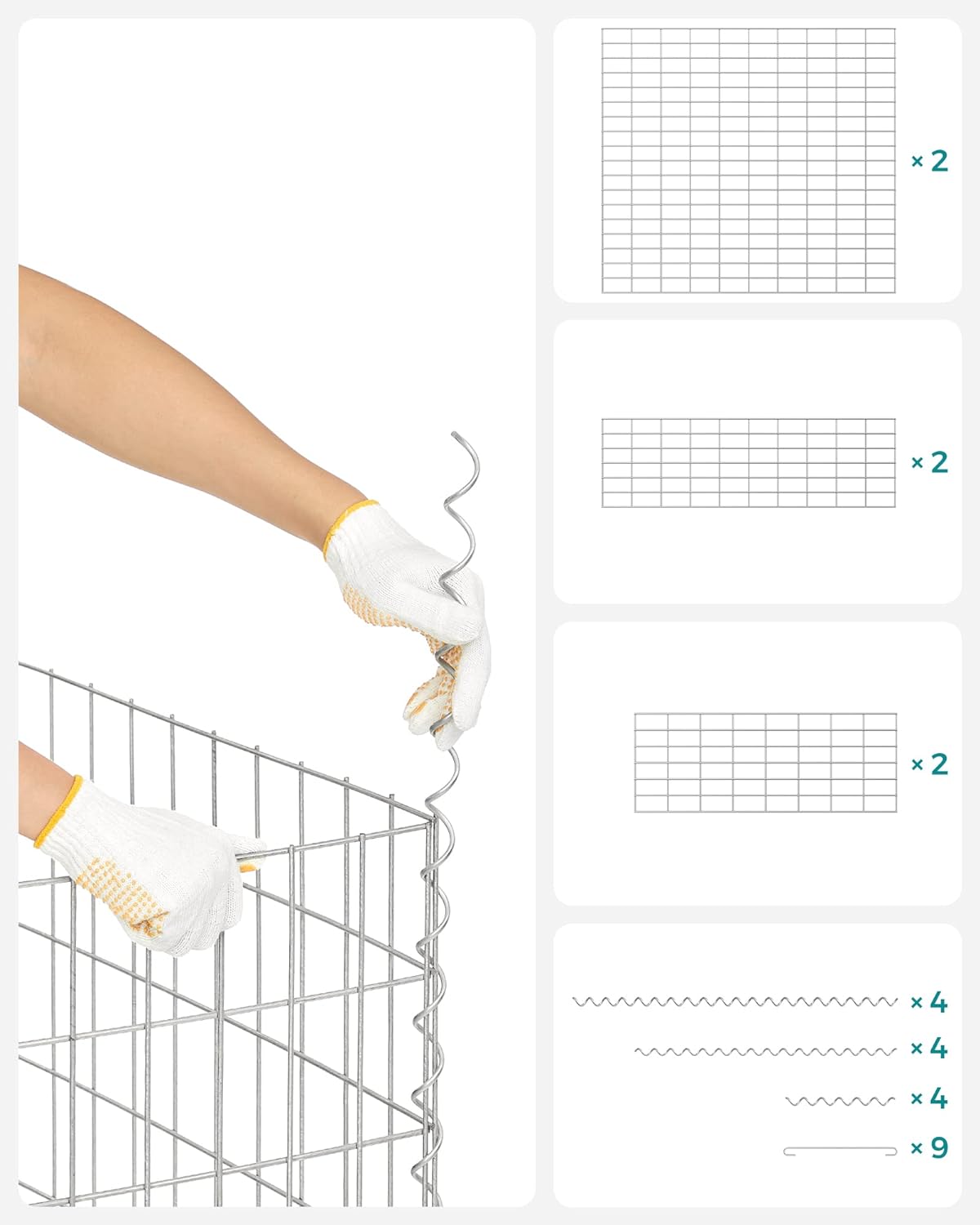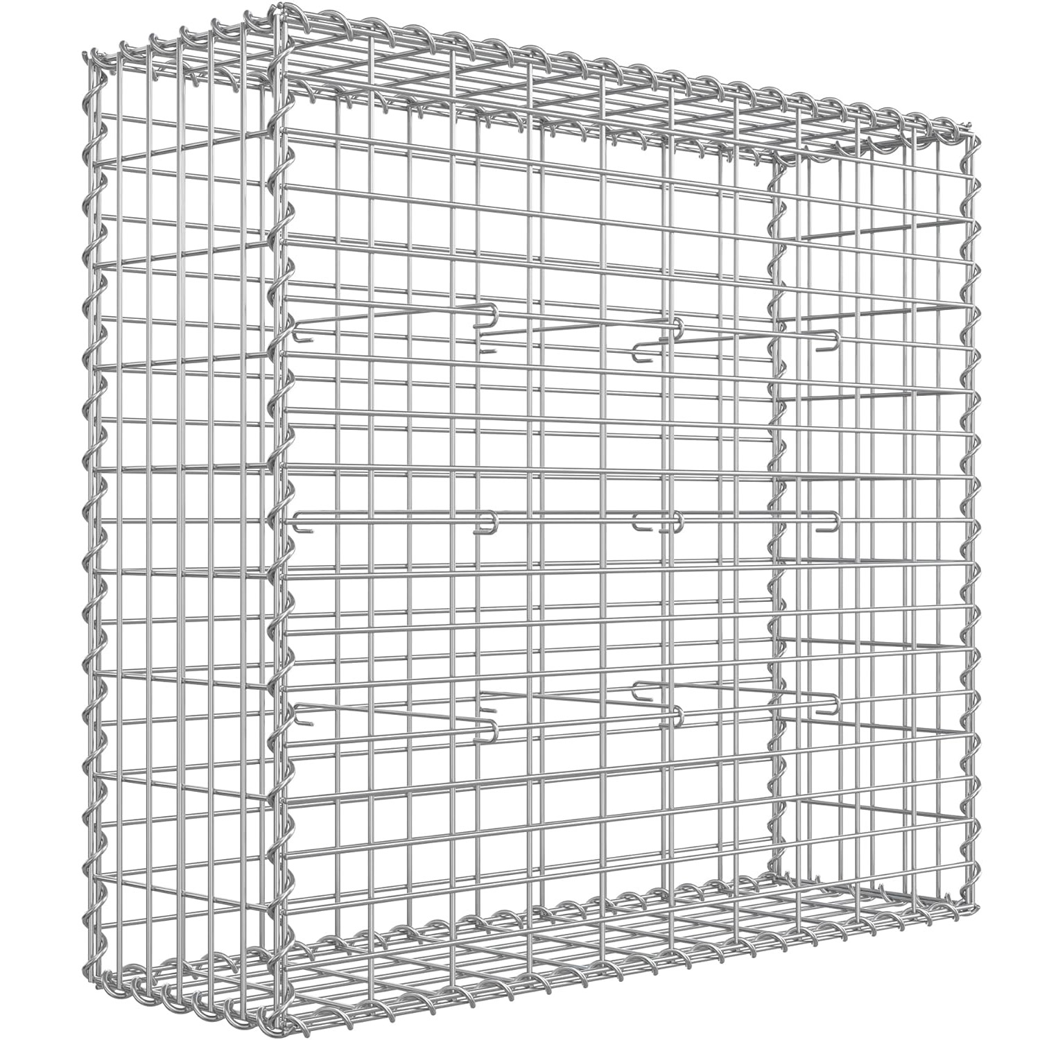 Nu este nevoie de scule pentru a asambla aceasta cusca de gabioane metalice! Pur si simplu aliniati grilele adiacente si rasuciti tijele in spirala pentru a le lega impreuna, apoi cosul gabion este gata de utilizare. 4 carlige de distantare incluse conecteaza panourile de sarma opuse strans impreuna, astfel incat aceasta cusca gabion isi poate pastra forma chiar si atunci cand este umpluta cu pietre sau alte materiale.