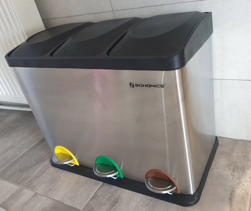 Amit kínálunk: 45 literes szemetes 3 részből, 3 pedállal és kivehető belső vödrökből az egyszerű hulladékkezelés és a problémamentes újrahasznosítás érdekében.