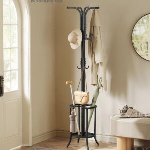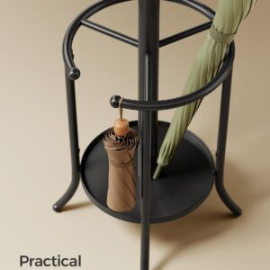 Praktikus esernyőtartó Ez az akasztó tartalmaz egy esernyőállványt kivágott résszel, amely hosszú és összecsukható esernyőkhöz is alkalmas, valamint egy csepptálcát, amely megvédi a padlót az esővíztől
