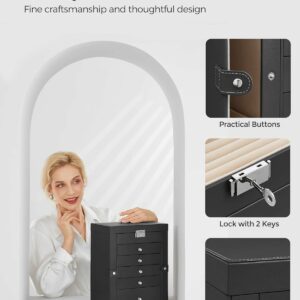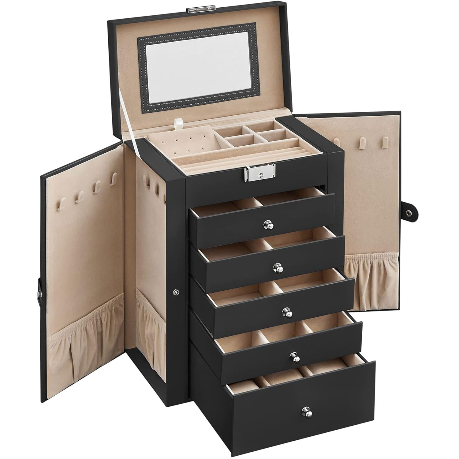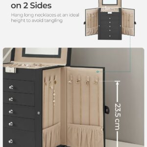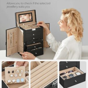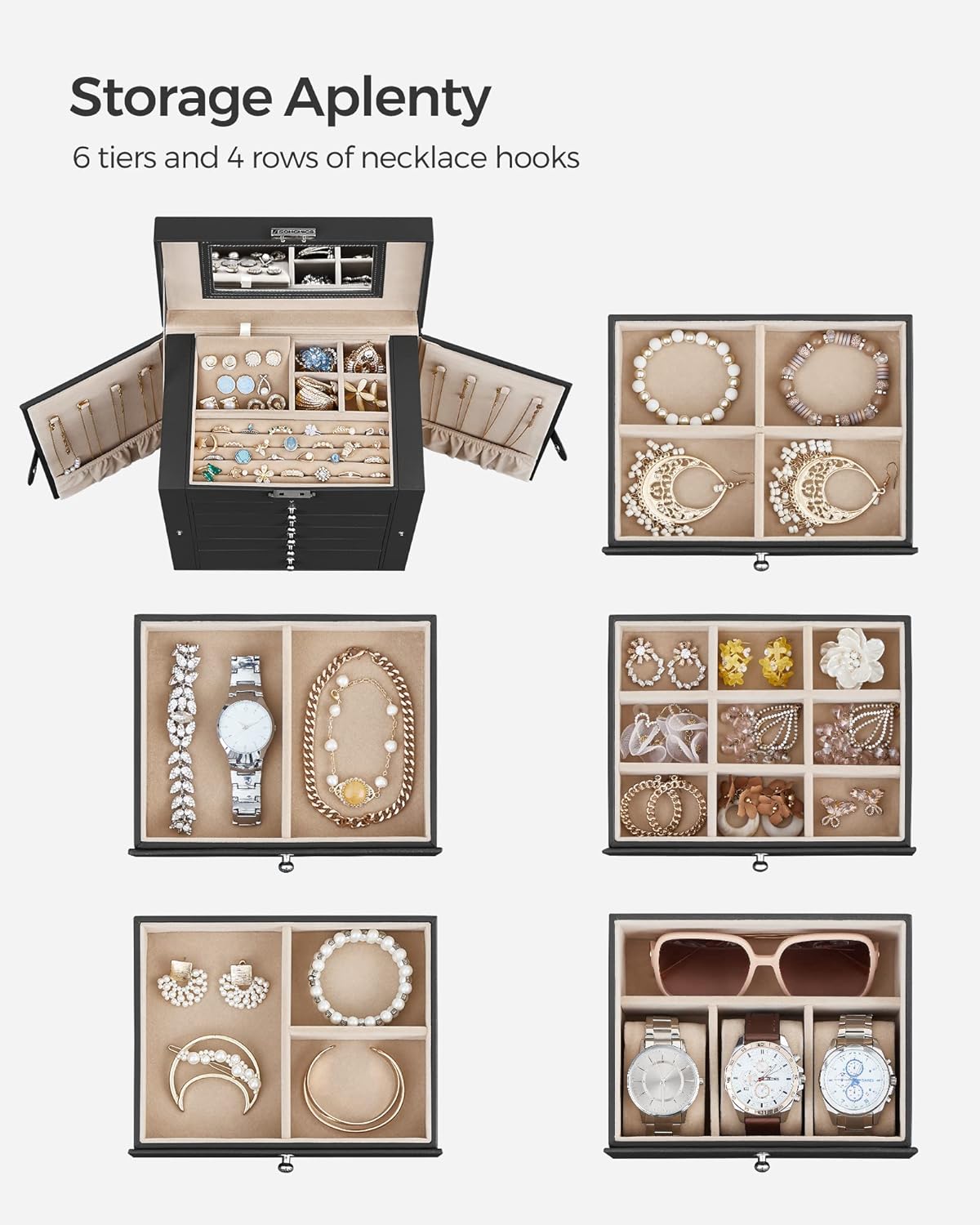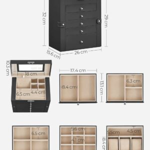 SONGMICS Ékszerdoboz 6 szintes, 5 fiókos, tükör, óratartó, zár, 16x26x32cm, fekete