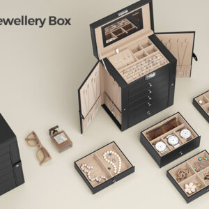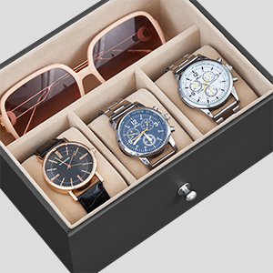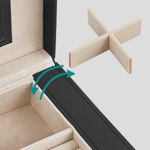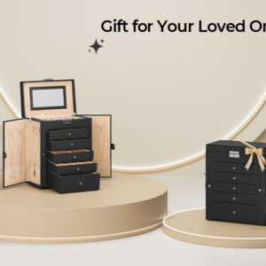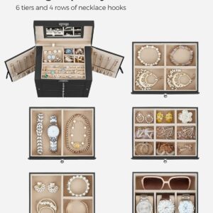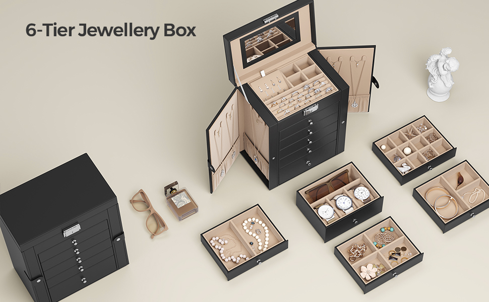 6x szintes, tágas: Ez a 6 szintes ékszerdoboz több rétegből áll, különböző rekeszekkel és elrendezéssel, hogy minden ékszerét, például fülbevalóit és gyűrűit rendezve és rendszerezve tartsa; a mély alsó fiókban 3 óra és egy napszemüveg is elfér.