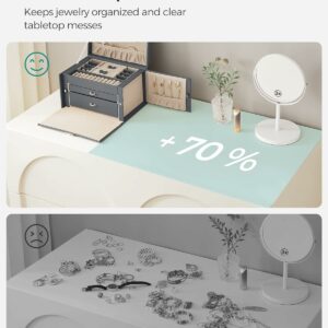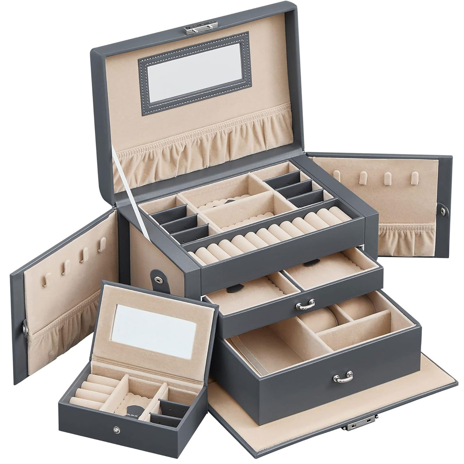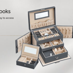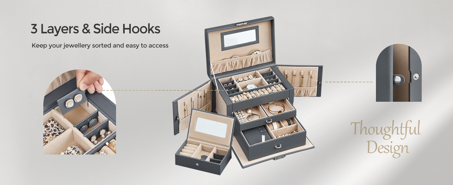 Compartimente separate, buzunare de catifea, deschideri pentru cercei cu stifturi, fante pentru inele, perne pentru ceasuri, carlige laterale pentru agatarea colierelor fara incurcaturi — aceasta cutie de bijuterii cu 3 niveluri ofera spatiu de depozitare pentru diversele tale bijuterii.