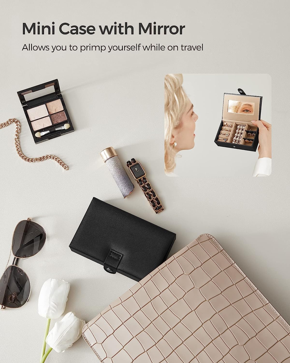 Mini husa de calatorie separata: Acest organizator de bijuterii vine cu o mini cutie de bijuterii de calatorie, care este perfecta pentru a aduce cateva piese in calatorie. A mini tokba tükör is tartozik.