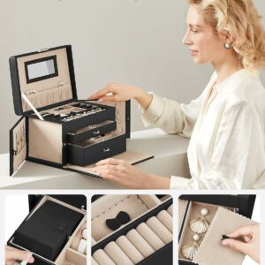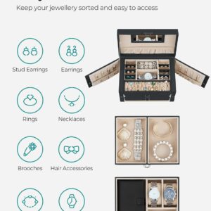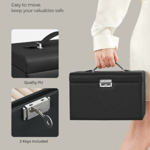 SONGMICS Ékszerdoboz 3 szintes, 2 fiókkal, tükörrel, fogantyúval, kulcsos zárral, 18x26x17cm, fekete