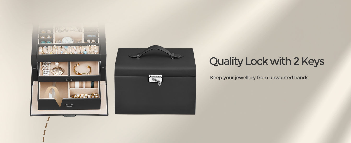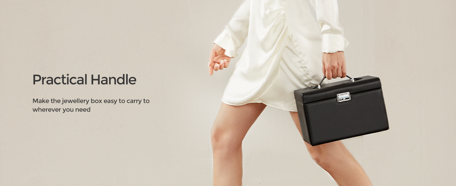 Lacat si maner practice: Aceasta cutie de bijuterii se incuie cu 2 chei pentru a va pastra obiectele de valoare in siguranta si la indemana; manerul de pe capac va permite sa transportati cu usurinta cutia de bijuterii oriunde doriti.
