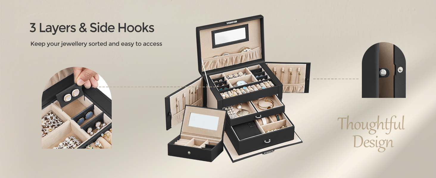 Külön rekeszek, bársonyzsebek, fülbevaló nyílások, gyűrűnyílások, órapárnák, oldalsó kampók a nyakláncok gubancmentes felakasztásához – ez a 3 szintes ékszerdoboz tárolóhelyet kínál különféle ékszereinek.